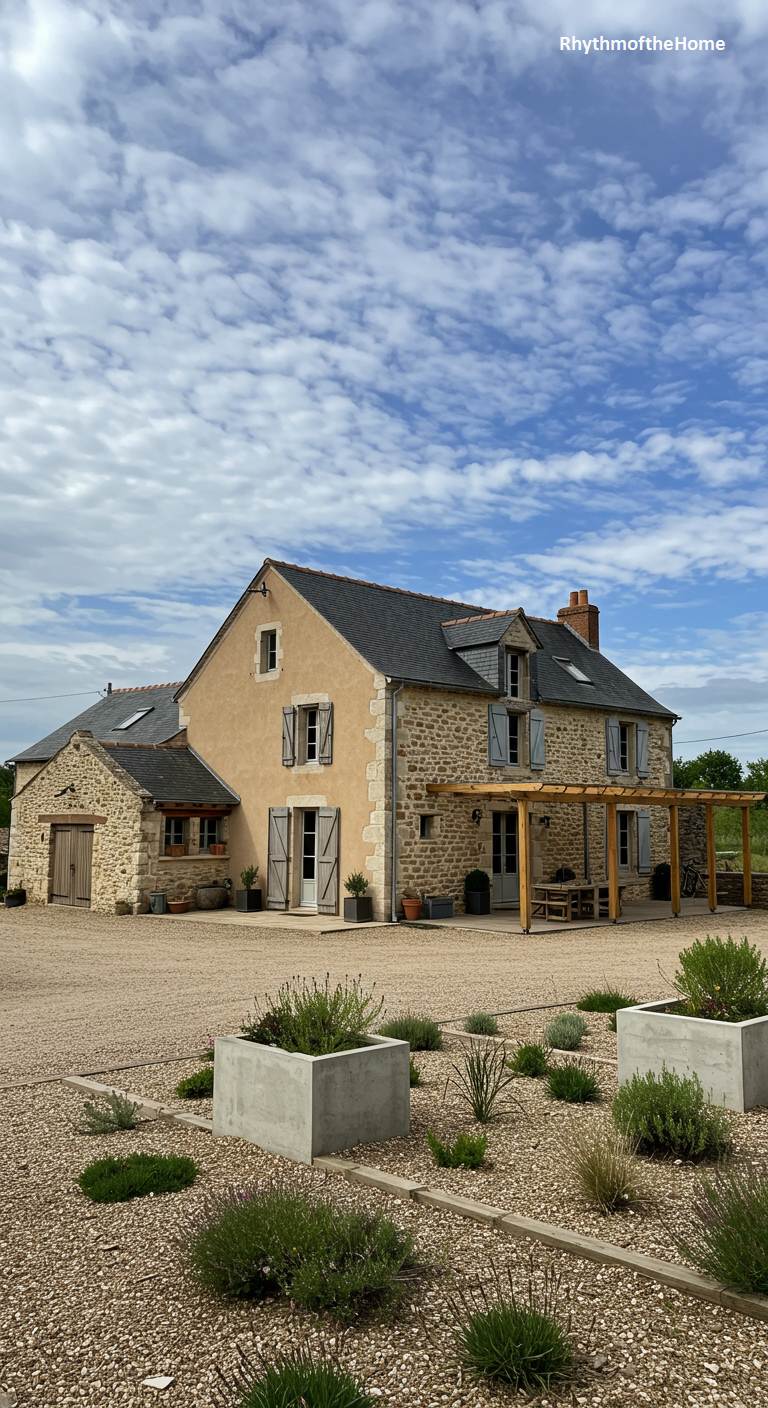 This property showcases a brilliant conversion of a traditional French farmhouse into a modern home. The main building retains its rustic charm with stone walls, a slate roof, and a simple stucco finish, but adds a contemporary wooden pergola for outdoor living. The surrounding gravel yard is dotted with minimalist concrete planters, a modern take on traditional garden beds. The overall aesthetic is clean, functional, and stylish, honoring the building’s agricultural roots while embracing a contemporary, uncluttered approach to country living.