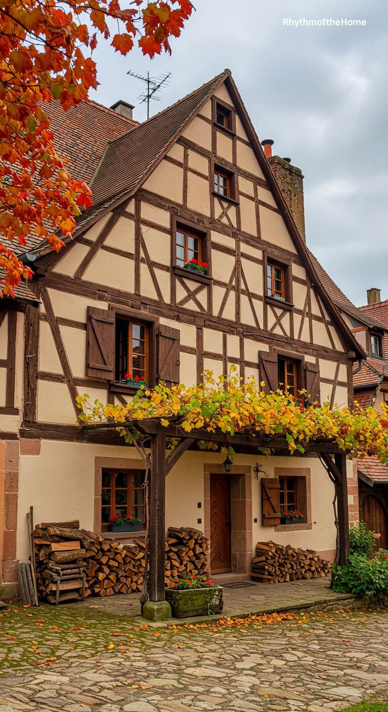 This charming French home perfectly captures the unique character of the Alsace region. Its distinctive half-timbered facade, with its rich brown beams set against light-colored stucco, is a hallmark of local architecture. A canopy of grapevines, its leaves turned a brilliant yellow for autumn, drapes over a rustic wooden pergola at the entrance. Stacks of firewood are neatly arranged, ready for the coming winter, adding to the cozy, lived-in feel. The scene is framed by the fiery red leaves of a nearby tree, grounding the home in the vibrant colors and rustic heart of the season.