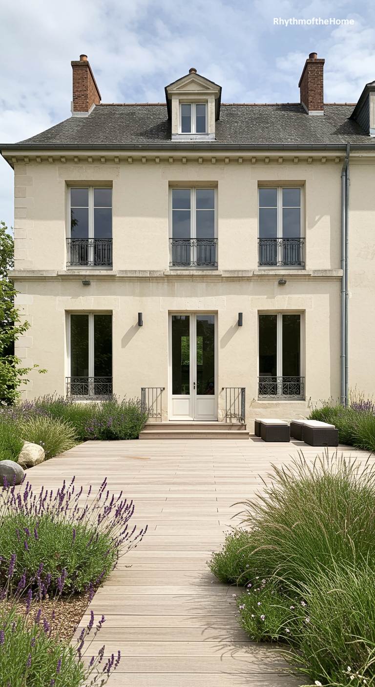 This French home represents a sleek, minimalist interpretation of classic design. The clean, unadorned stucco facade is punctuated by simple, elegant windows with delicate iron railings. The traditional garden has been replaced by a modern, expansive wooden deck, which creates a seamless transition from the interior to the outdoors. The landscaping is naturalistic and textural, with soft ornamental grasses and lavender beds that require minimal maintenance. It’s a serene and sophisticated space, perfect for modern life, that prioritizes clean lines and natural materials.