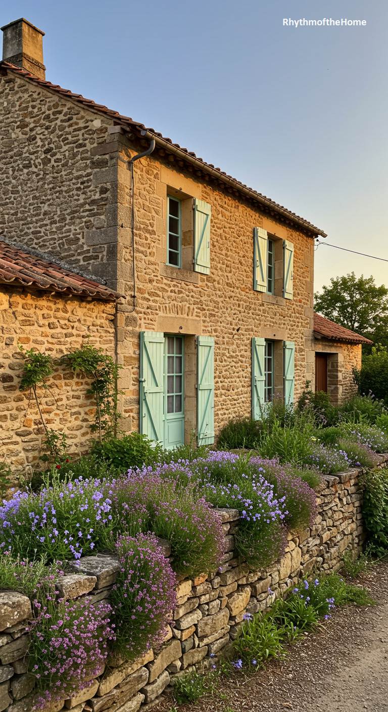 Bathed in the warm, golden light of the setting sun, this rustic stone French home is the picture of pastoral bliss. The rough, honey-colored stone walls seem to glow, while the cheerful mint-green shutters provide a fresh and charming splash of color. A low stone wall in the foreground is topped with a profusion of purple and pink flowers, creating a lovely, informal cottage garden. The scene is simple, peaceful, and deeply evocative of a slow, beautiful evening in the heart of the French countryside.