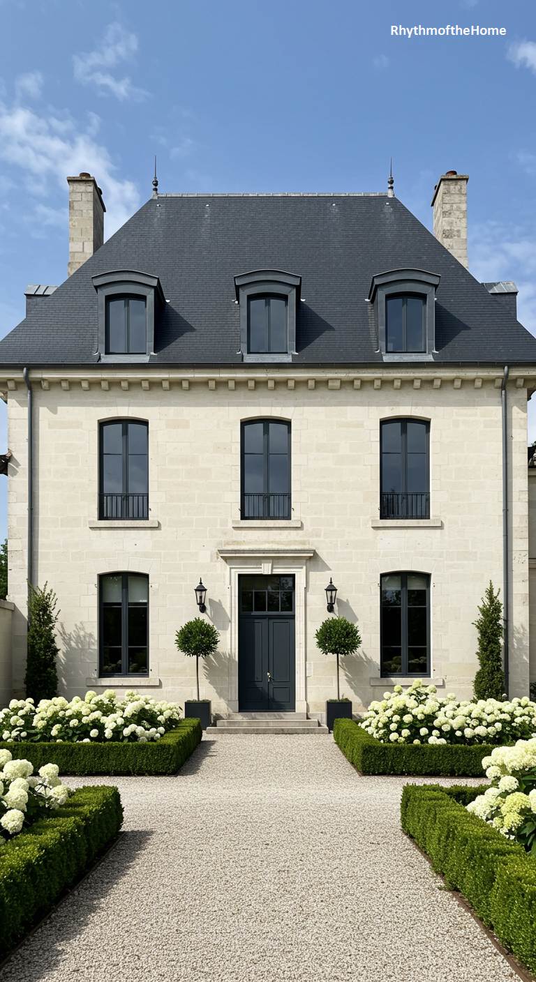 This impeccable French home is a modern interpretation of a classic château. The facade is a clean, symmetrical composition of pale stucco, crowned by a traditional slate mansard roof. The windows and front door are a bold, contemporary black, creating a striking graphic contrast. Two conical topiaries in black planters flank the entrance, reinforcing the formal, modern aesthetic. The landscaping is precise and minimalist, with a gravel driveway bordered by perfectly clipped boxwood hedges. It is a residence of incredible polish, blending timeless proportions with a chic, modern palette.