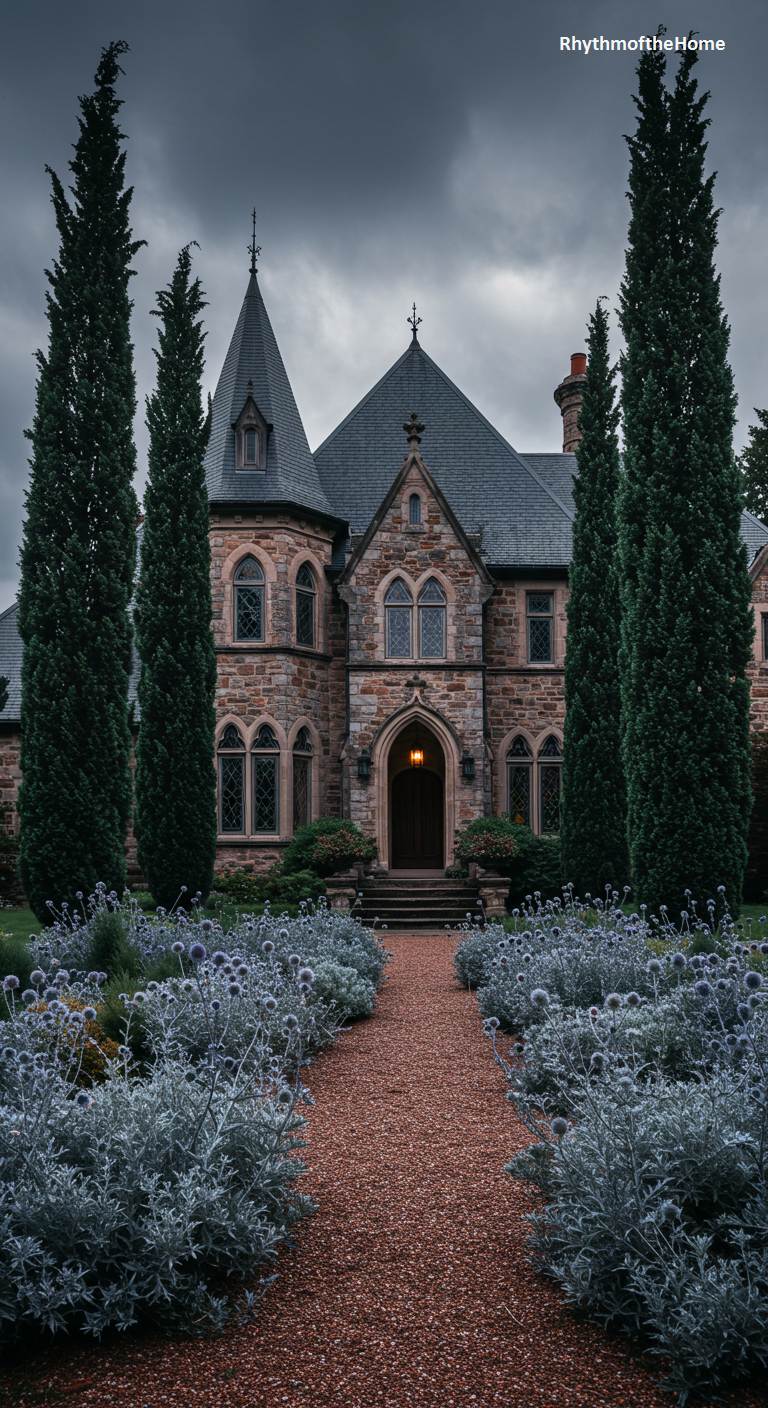 This moody and magnificent French manor has a wonderfully gothic, almost brooding presence. The dark stone facade, with its pointed-arch windows and prominent turret, is framed by tall, dark cypress trees. The path leading to the entrance is made of a reddish gravel and is lined with the unusual and striking globes of sea holly or thistles, their silvery-blue color perfectly complementing the stormy atmosphere. With an overcast sky overhead and a single warm light glowing in the entryway, this home feels like the setting for a sophisticated and mysterious gothic romance.