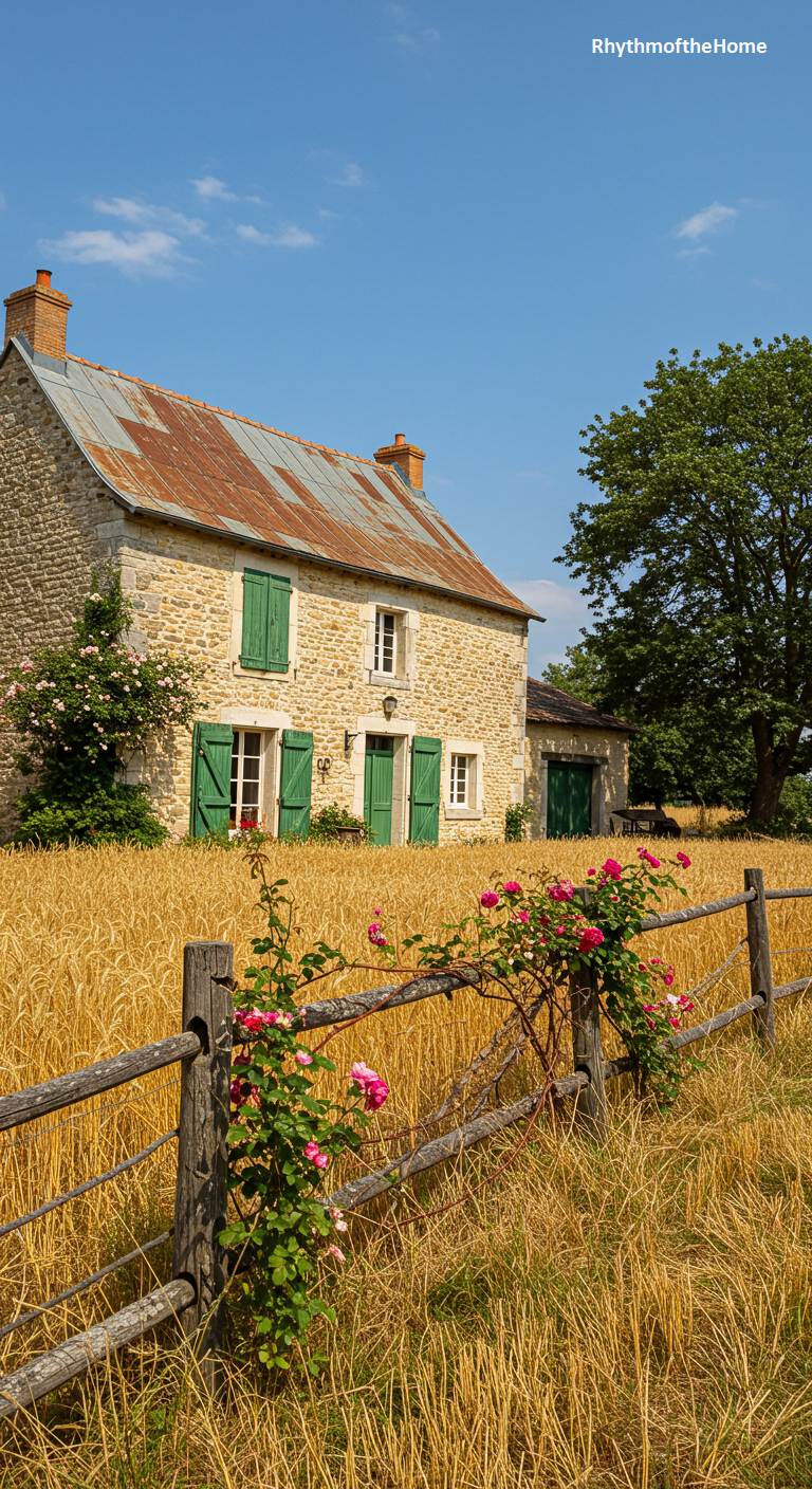 This humble and beautiful French home is perfectly at home in its agricultural setting. Its walls are made of weathered, honey-colored stone, and it is topped with a rustic, slightly rusted metal roof that tells a story of time and seasons. Green shutters and a climbing rose bush add touches of life and color. The house is surrounded by a field of golden wheat, with a simple wooden post-and-rail fence separating the home from the harvest. It is a timeless and authentic image of rural French life, simple, hardworking, and beautiful.