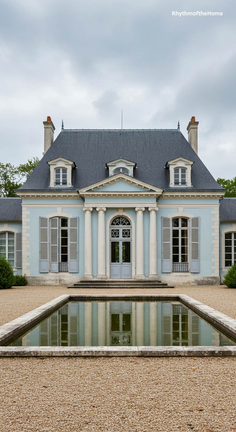 This elegant French home puts a unique color twist on a classic Neoclassical design. The facade is painted a delicate and sophisticated powder blue, with the architectural details—columns, window frames, and cornices—highlighted in a crisp white. This soft color palette gives the grand, symmetrical structure a lighter, more ethereal feel. A formal reflecting pool in the foreground mirrors the home’s serene beauty, set within a clean gravel courtyard. It is a stunning and memorable residence that is both stately and refreshingly unique.