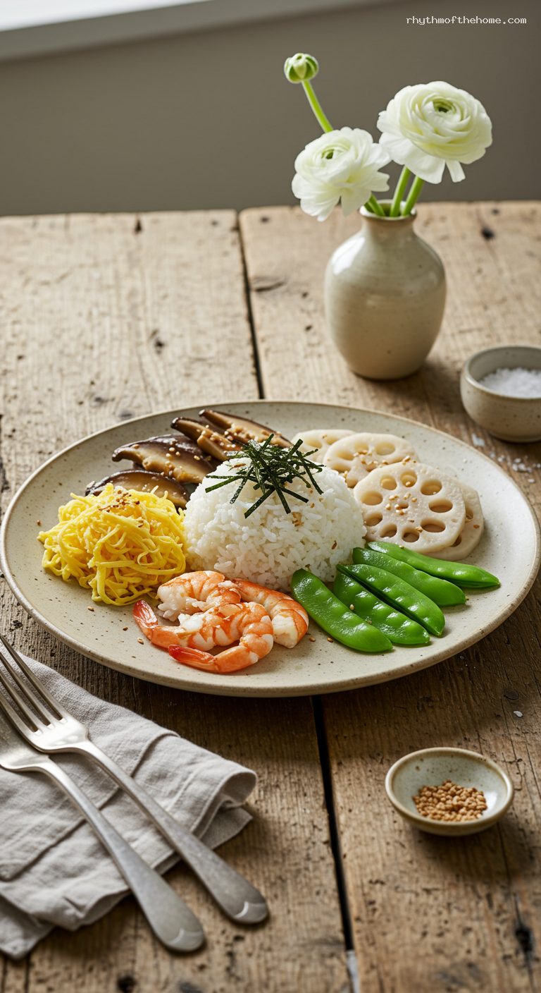 Gently fluff the seasoned rice and mound it on a wide, shallow platter or into individual bowls. Scatter the shredded omelet over the rice. Arrange the glossy shiitake, shrimp, lotus root, and snow peas in colorful sections or a mosaic. Finish with a shower of shredded nori and a sprinkle of sesame seeds. Serve with pickled ginger on the side.