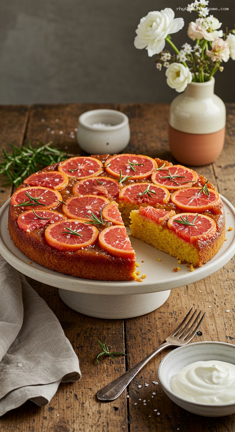 - 1. Heat oven to 350°F (175°C). Lightly oil a 9-inch oven-safe skillet or line a 9-inch round cake pan with parchment. Make caramel: simmer 1/2 cup brown sugar, 3 tbsp olive oil, 2 tbsp grapefruit juice, rosemary sprig, and a pinch of salt for 2–3 minutes; pour into pan and arrange citrus wheels.