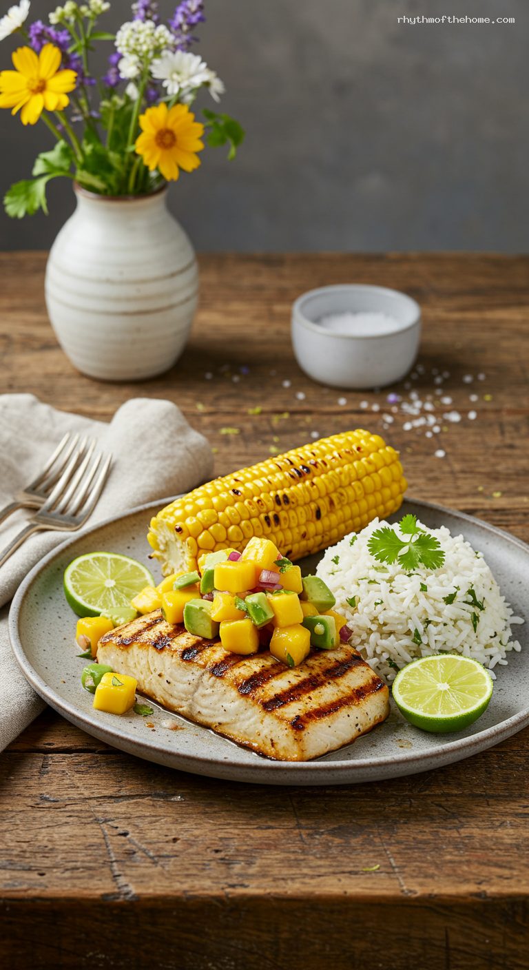 Spoon a bed of cilantro-lime rice onto each plate. Top with a mahi-mahi fillet and a generous scoop of mango–avocado–lime salsa. Add a grilled corn on the side and garnish with cilantro leaves and lime wedges. Serve immediately.