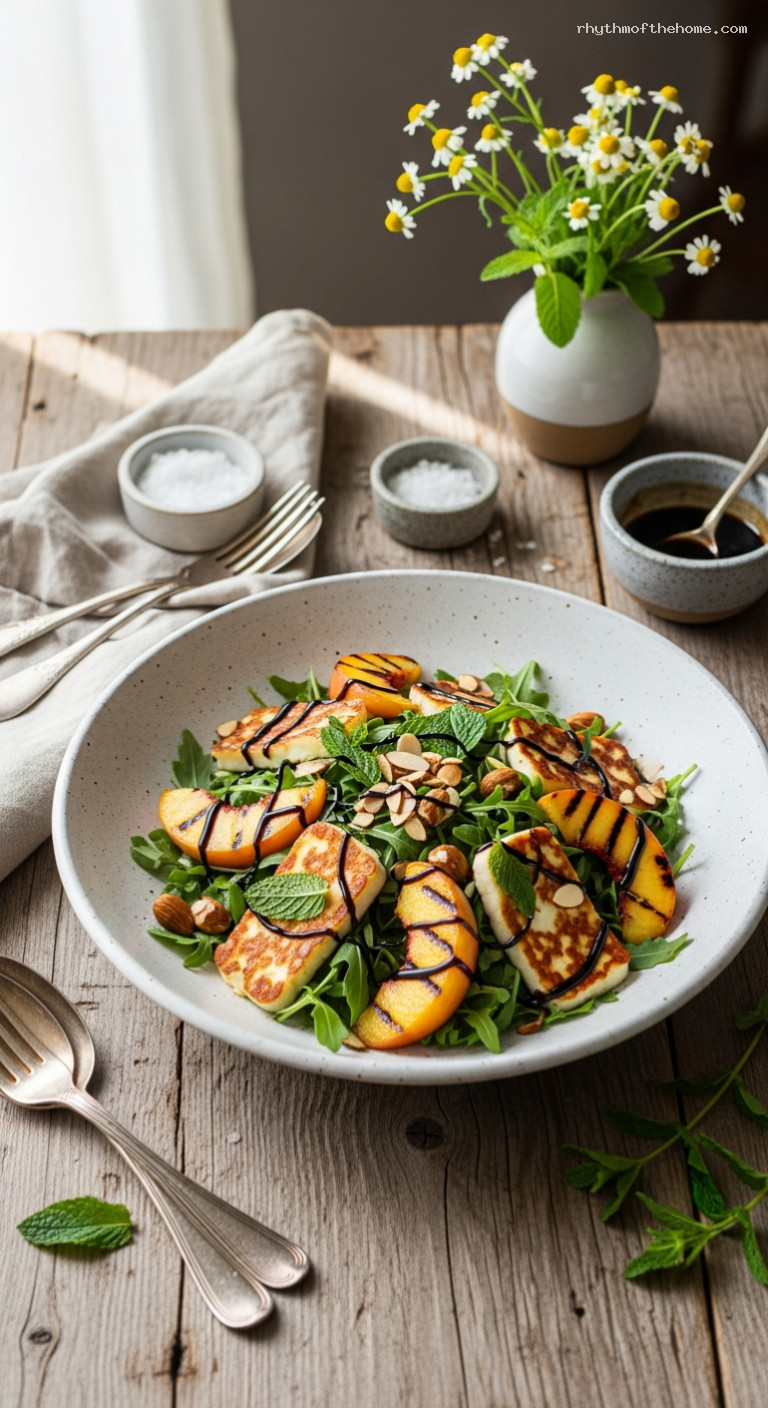 Spread the dressed greens on a wide platter. Nestle in the grilled peach wedges and halloumi. Scatter toasted almonds over the top. Drizzle with 2–3 tbsp balsamic glaze. Finish with a pinch of flaky sea salt if you like. Serve right away while the halloumi is warm.