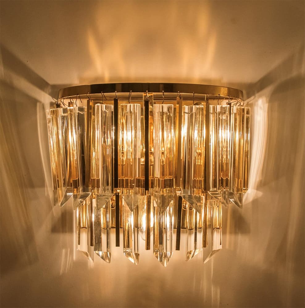 Glass and brass gleam together in this intricate sconce that would turn any hallway into an art gallery. Each prism rod is two-faced, with crystal glass rods with brass details and a backplate. Each light requires two 40W bulbs to shine its light.