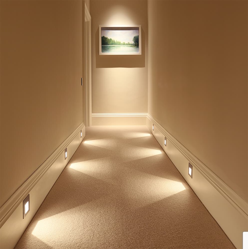 Spaced Sirolo floor-washer lights not only skew light patterns across the floor but they also create the illusion of depth and substance in the hallway, taking an unremarkable hallway and converting it into a walkway into a different universe.
