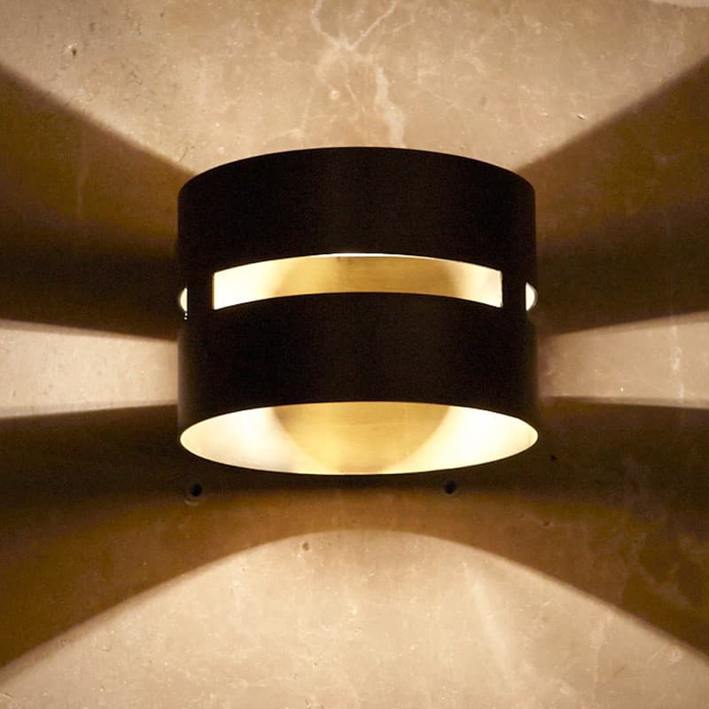 The metal version of the Luz Oculta includes a vent around the middle of the round lampshade, giving light another pathway for spilling out. The net effect on parabolic arches of light above and below with shafts of lighthouse beans flying out of the sides gives this wall lamp its uniqueness. The wood version has small spaces between each wood panel, creating a unique multi-directional throw of lights and shadows.