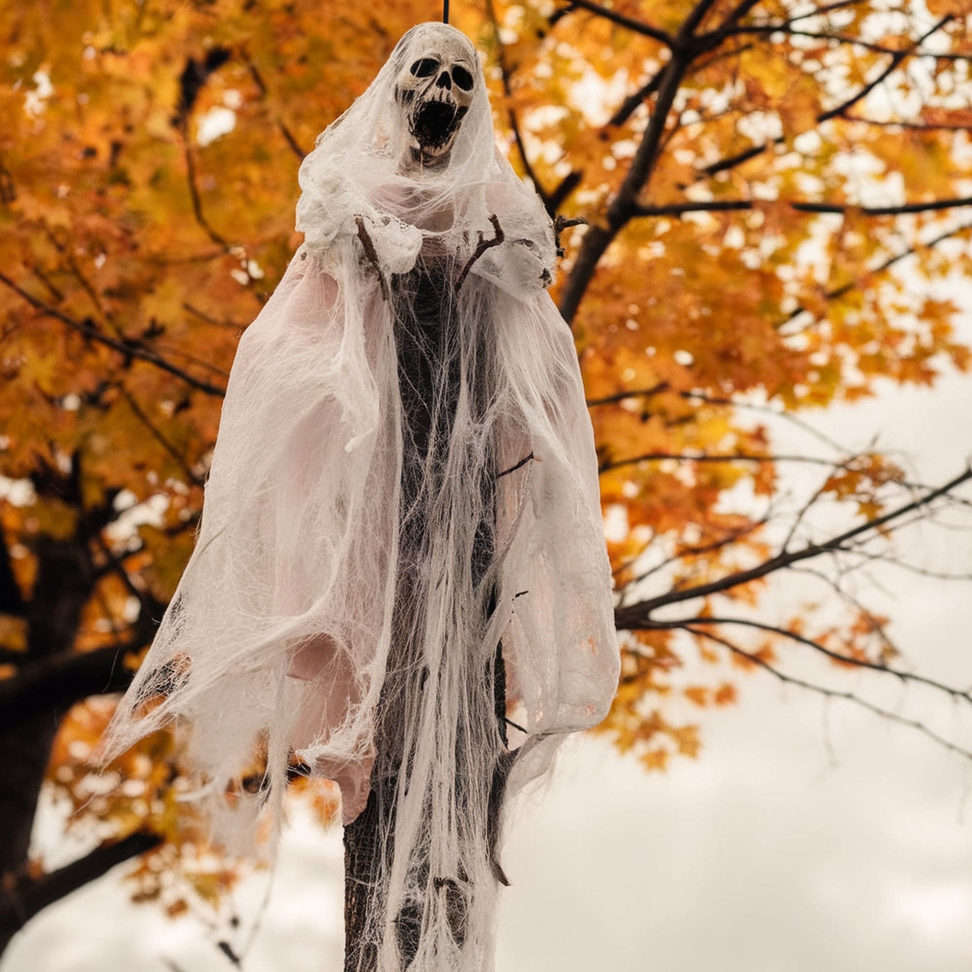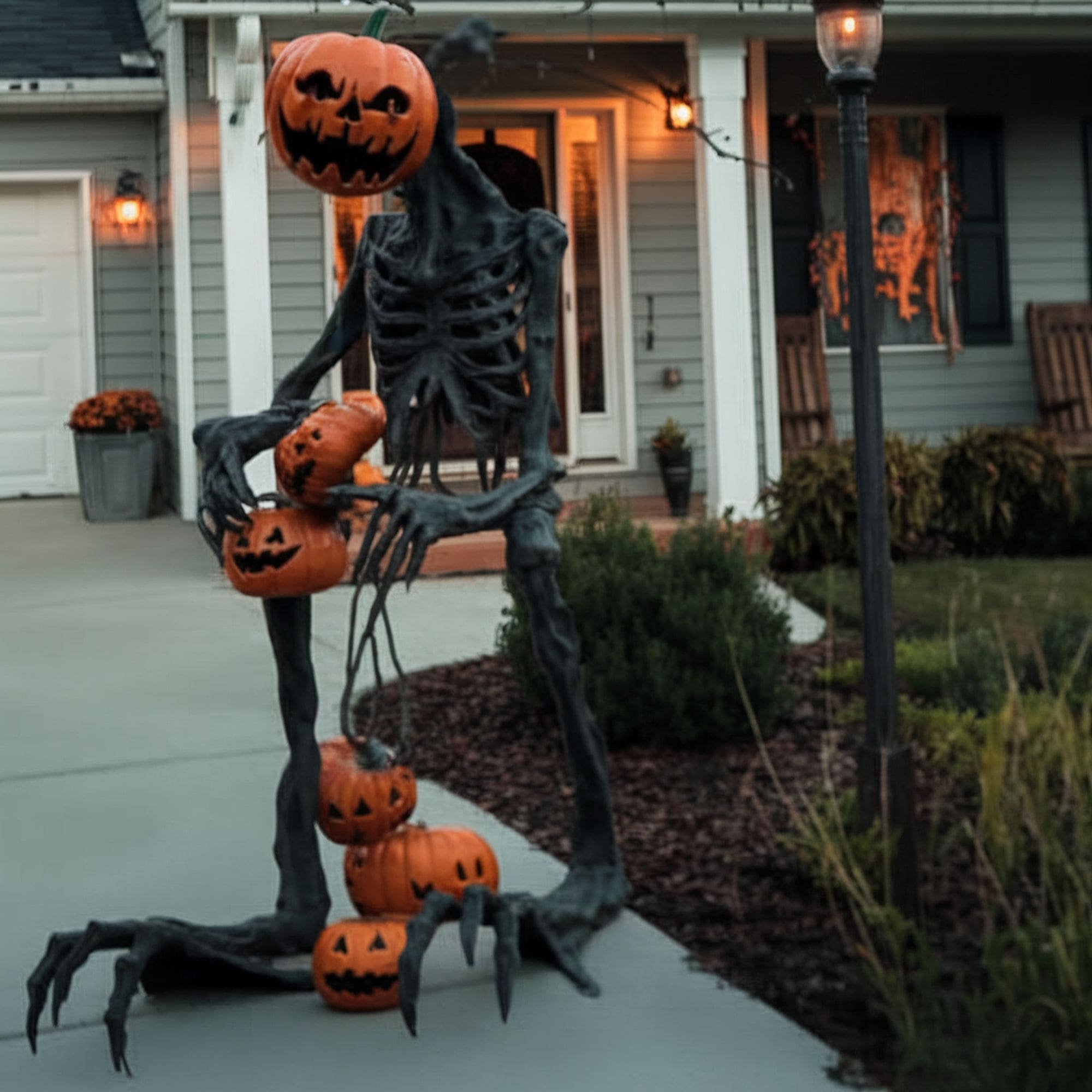 Tall and incredibly frightening, this ominous decoration features a wooden frame with black wrap resembling a strange otherworldly creature. The pumpkin head is what makes this a particularly eerie decoration to bring into your haunted garden. To make the display even more disturbing, it’s recommended to hide the pumpkin creature under a tree so that Halloween visitors will get a creepy surprise when they notice it.