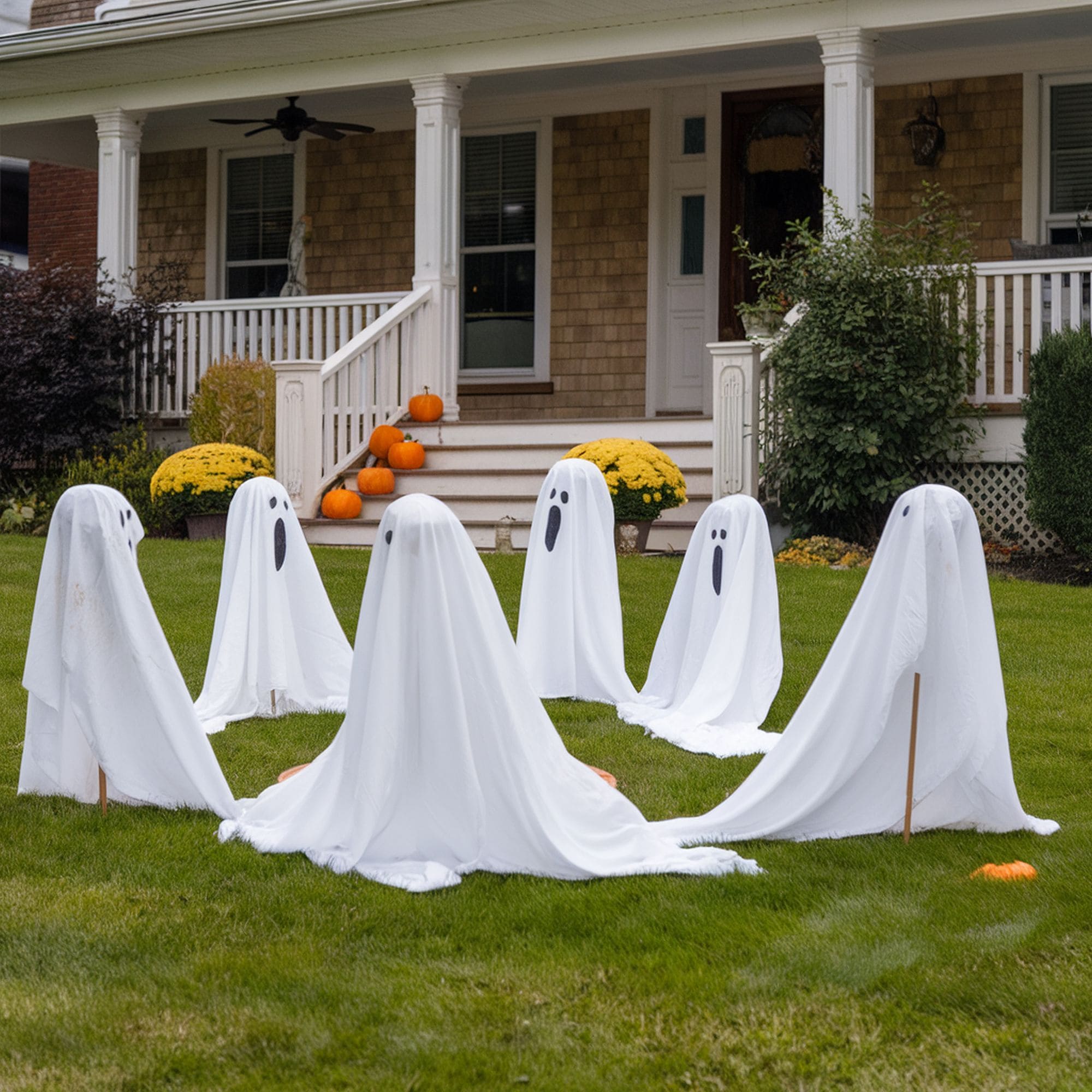 If you’re going for a truly haunted garden aesthetic, the best choice is to put your DIY skills to good use and craft a party of eerie ghosts to boost the spookiness of the area. White sheets, thread, and stuffing fabric can be used to create all kinds of interesting ghost decorations for the front yard. For those who feel that it takes too much effort, there are some great decorative sets featuring ghosts that can be purchased. Here’s a great example from Home Depot.