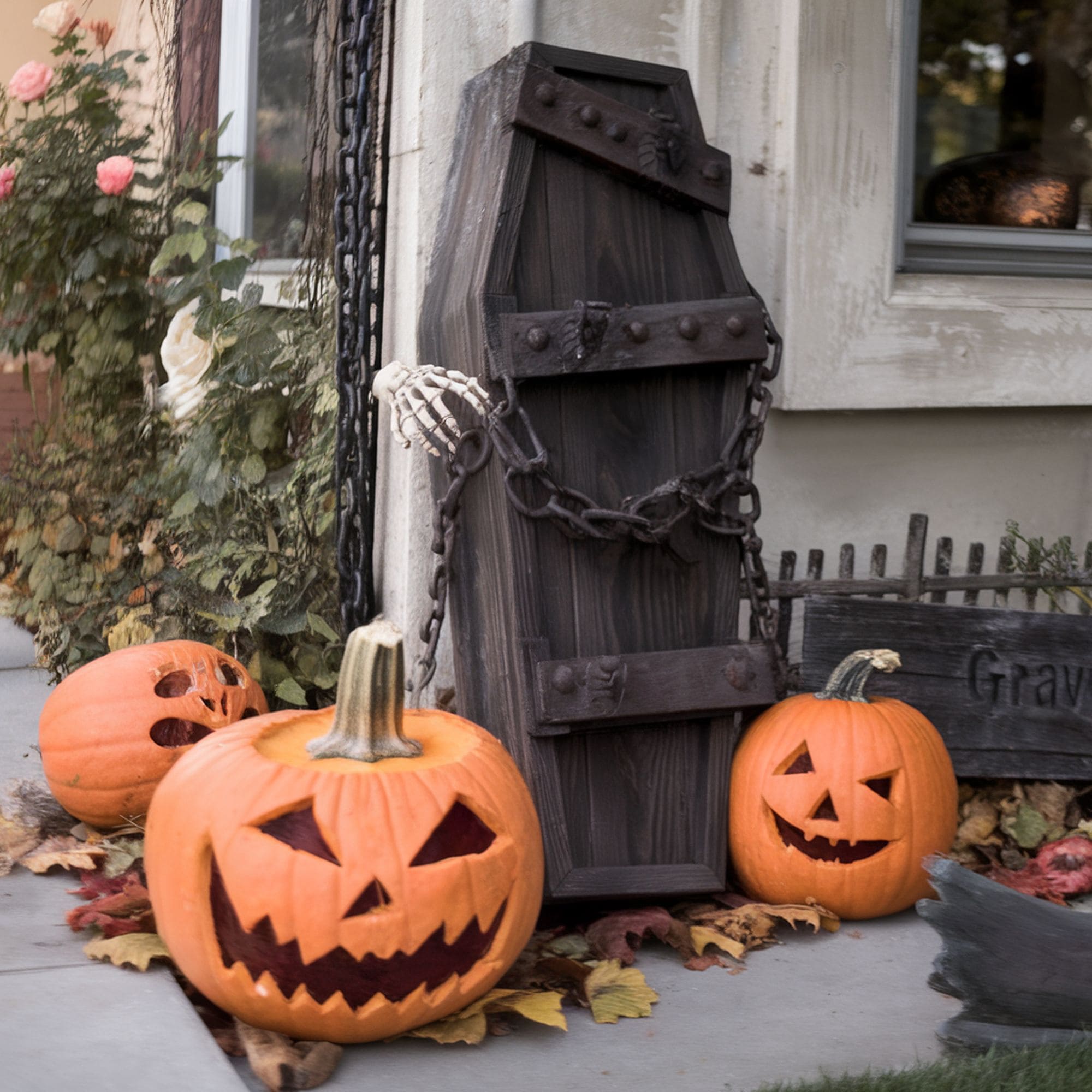 A creepy zombie coming out of the ground sets the stage for any outdoor Halloween décor. Use a set like this one from Amazon that contains zombie head and arms which can be firmly placed in your lawn with the help of integrated stakes. This is quite a spooky decoration that will seem scarier at night to any passing guests.