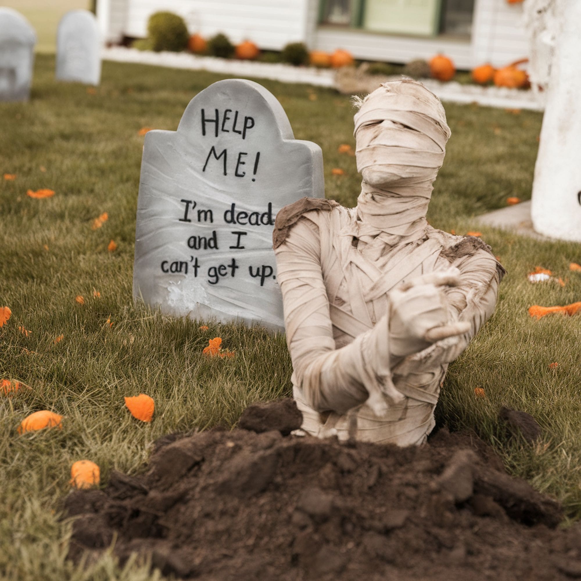 While not as popular as other Halloween decorations, mummy props can definitely scare some trick-or-treaters. One great advantage of this idea is that it takes minimal effort to craft pretty realistic-looking mummies to introduce into your haunted garden. You don’t even need to create a complete mummy as one with just half its body does a better job at spooking guests.