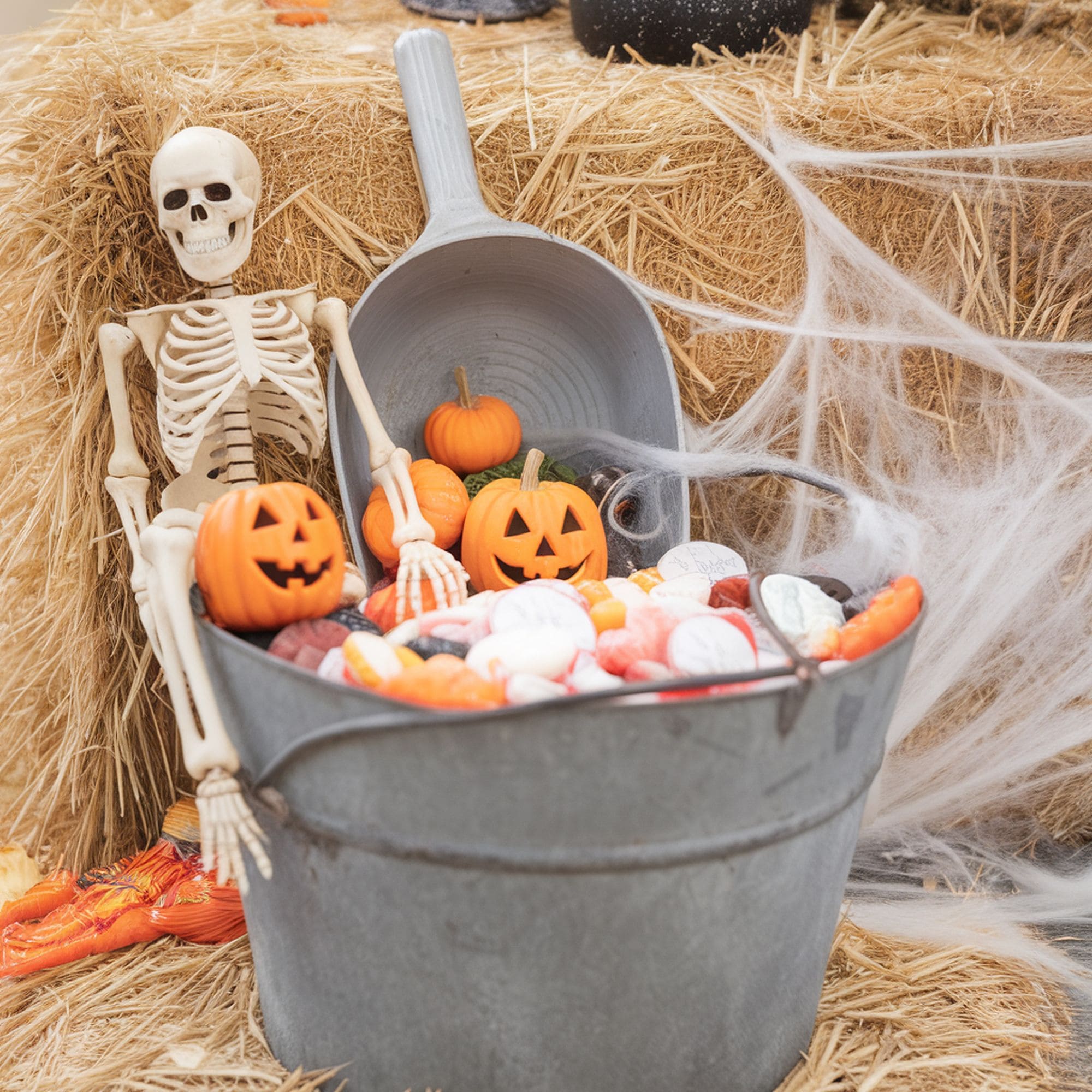 This is a more rustic decoration that can work pretty well for a spooky Halloween theme in the garden. It will make it easier for trick-or-treaters to find their treasure for those times when you don’t want to answer the door. Aside from the old metal bucket, you can finish off the arrangement with a little skeleton and some miniature pumpkins. The hay bale backdrop is a nice touch.