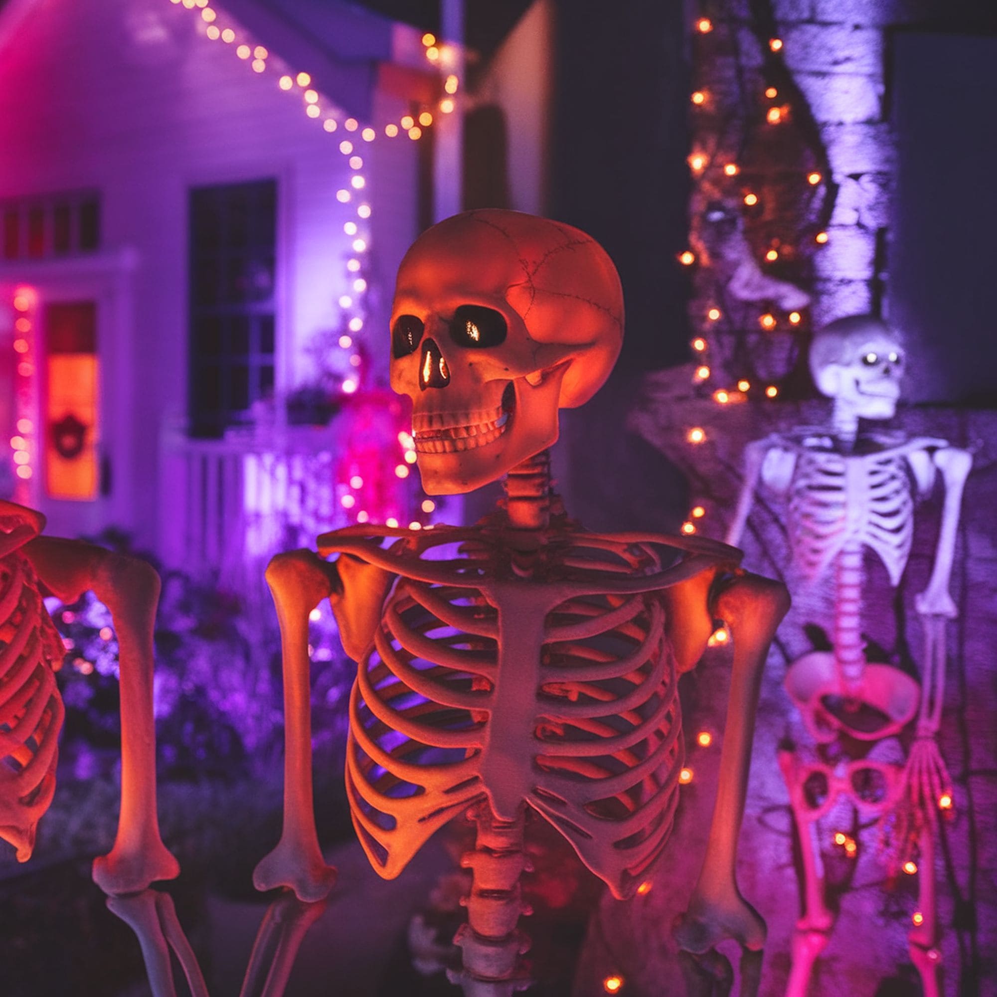 Twist these Halloween-themed string lights around the porch railing or incorporate them throughout other decorations from the garden to enhance the haunted look with some festive lighting. Check out this set of Halloween lights from Amazon that offers different combinations of jack-o’-lanterns, ghosts, and bats. Each of them comes with custom eerie glows to make your front yard stand out from the rest.