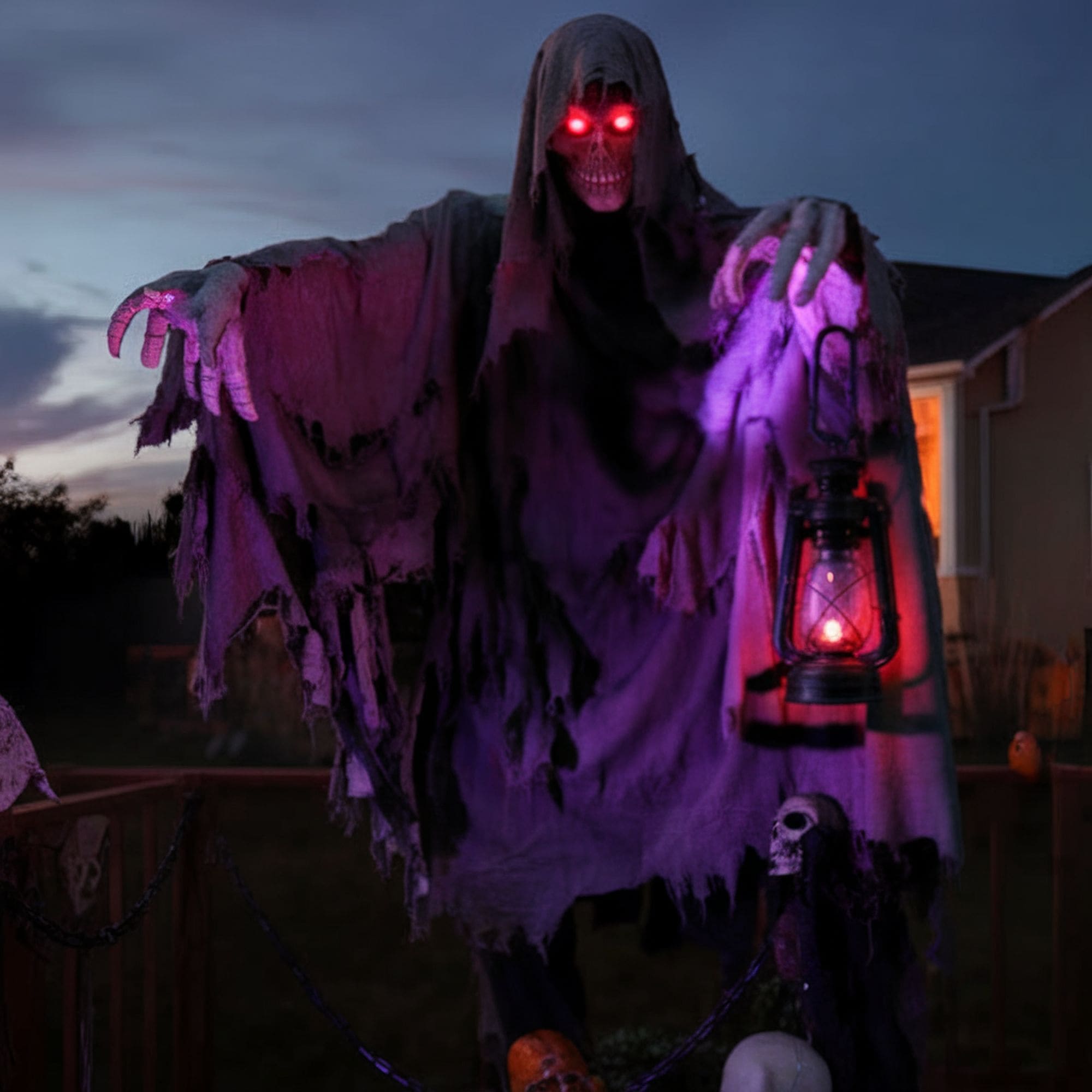 While skeletons and ghosts can bring a decent haunted feel for a Halloween-themed garden, the grim reaper remains one of the most visually impressive motifs to include. Take a look at the amount of detail on this spooky decoration. The eerie purple lighting further accentuates the look while the multiple skulls on the chain symbolize the reaper’s victims.