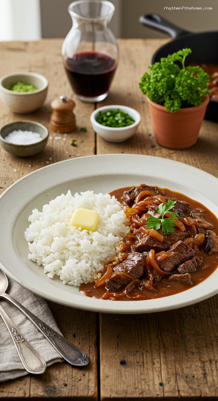 - 6. Return beef and any juices; simmer 3–5 minutes. Swirl in 1 tbsp butter, adjust salt/pepper, discard bay leaf. Spoon over buttered rice; garnish with parsley.