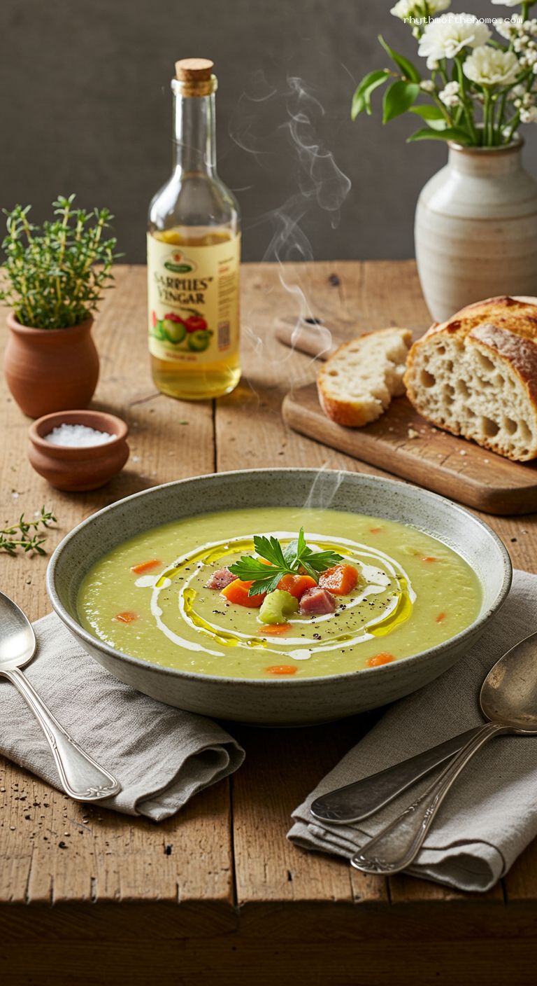- Pantry: Dried green split peas, olive oil, low-sodium chicken broth (or water), bay leaves, dried thyme, apple cider vinegar, kosher salt, black pepper, smoked paprika (optional)