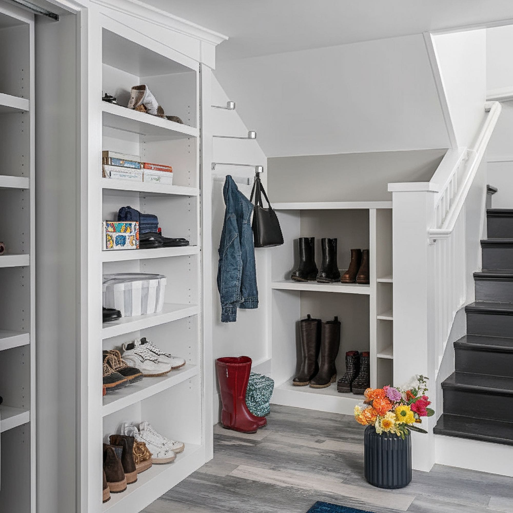 If you have a large storage area for your shoes, you can make it a faux door, just like in the numerous cases for bookshelves. This entry area has beautifully ordered shoes and other items while offering access to a hidden room.