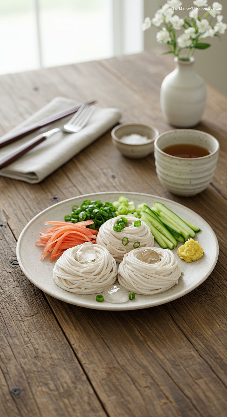 Twirl small nests of noodles onto the chilled plates. Add a few ice cubes around the noodles to maintain temperature. Arrange toppings in small piles or in tiny dishes: cucumber, myōga, scallions, and grated ginger (plus optional shiso and sesame). Pour the cold tsuyu into the chilled dipping cups and set alongside.