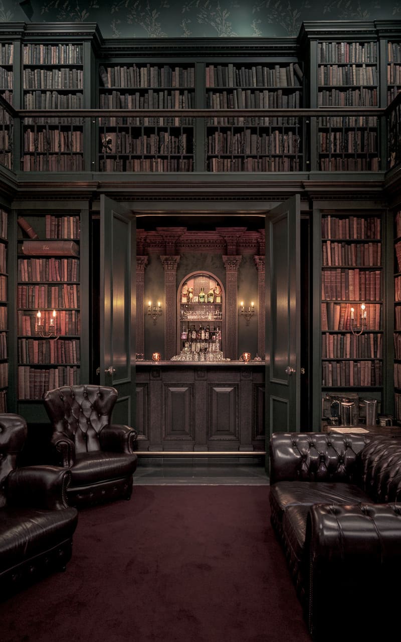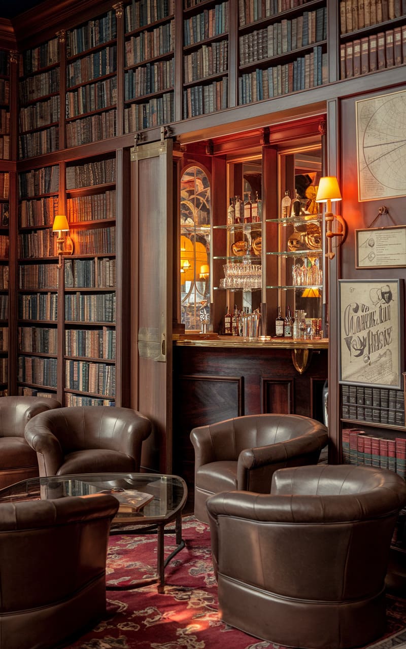 4. Secret Library Speakeasy with Warm Tones and Hidden Doors