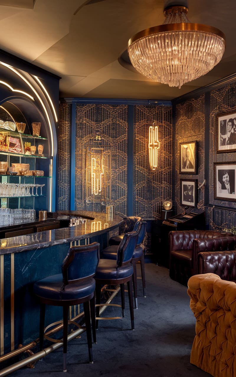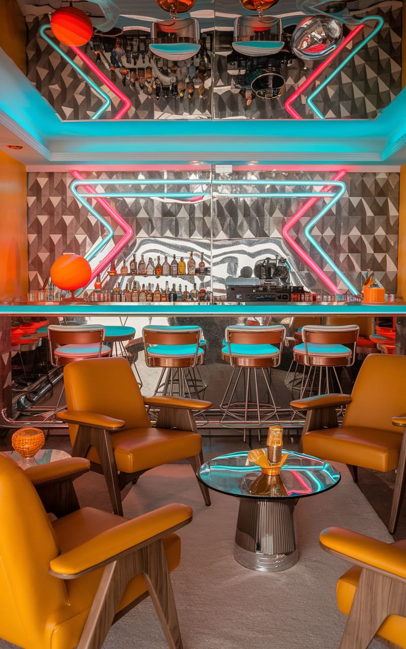 8. Mid-Century Modern Speakeasy with Neon and Chrome