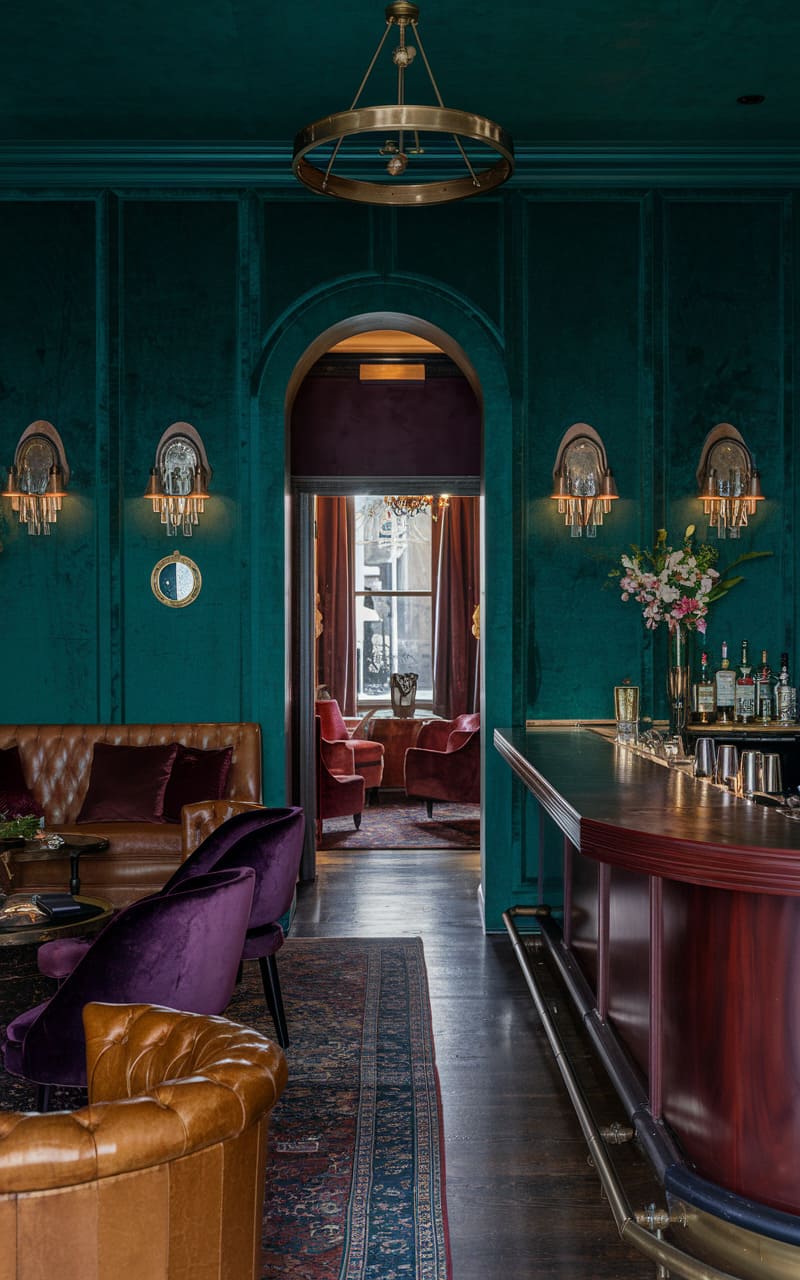 9. Speakeasy with Velvet Luxe and Dark Green Hues