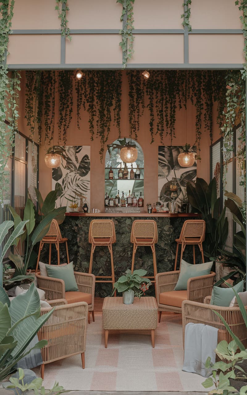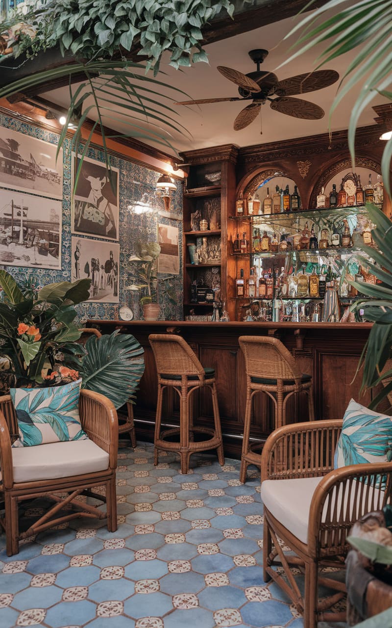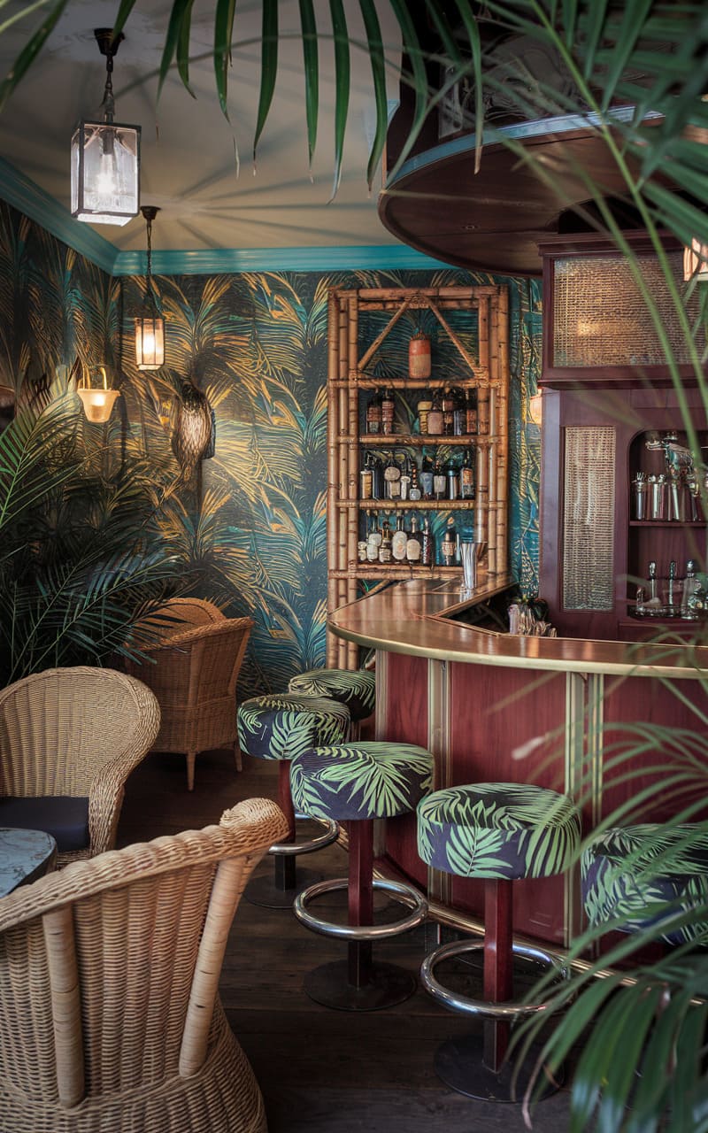 5. Tropical Speakeasy with Bamboo, Rattan, and Velvet Accents
