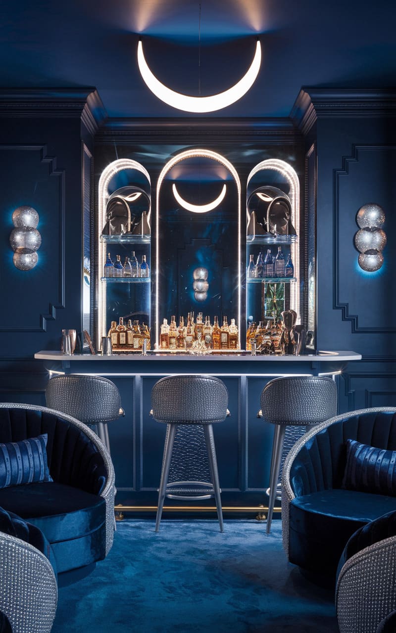 Bathed in moody blues, this clandestine home bar exudes a sophisticated allure, its art deco-inspired design punctuated by sleek, mirrored shelving and plush velvet seating. A playful crescent moon light fixture casts a soft glow upon the curated collection of spirits, while the geometric patterns of the walls and rug add a touch of vintage charm. The result is a space that feels both intimate and glamorous, perfect for whispered conversations and expertly crafted cocktails. Gleaming barware and bottles line the countertop, hinting at the revelry this space is designed to host.