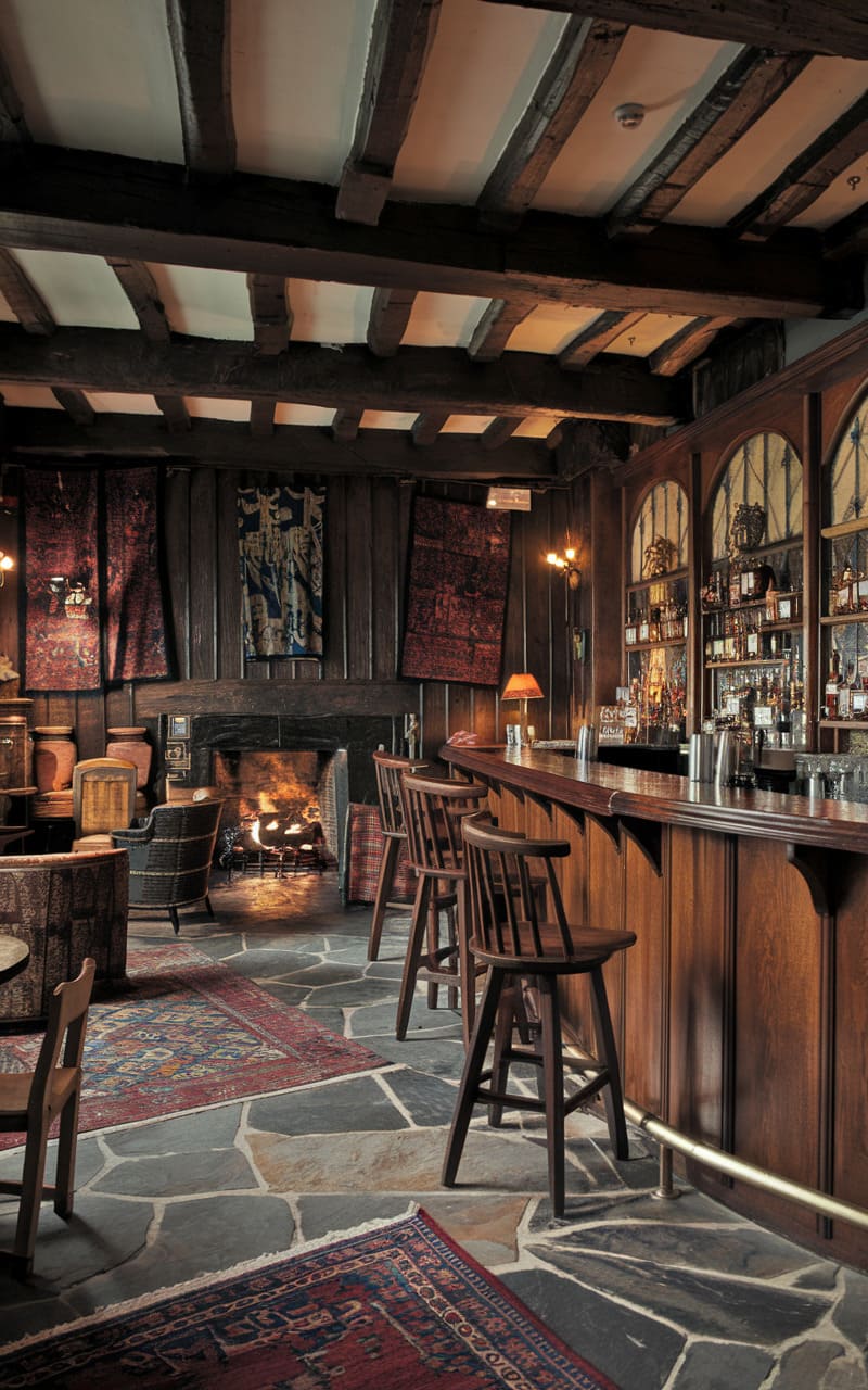 18. Tudor-Style Speakeasy with Wood Paneling and Mismatched Furniture