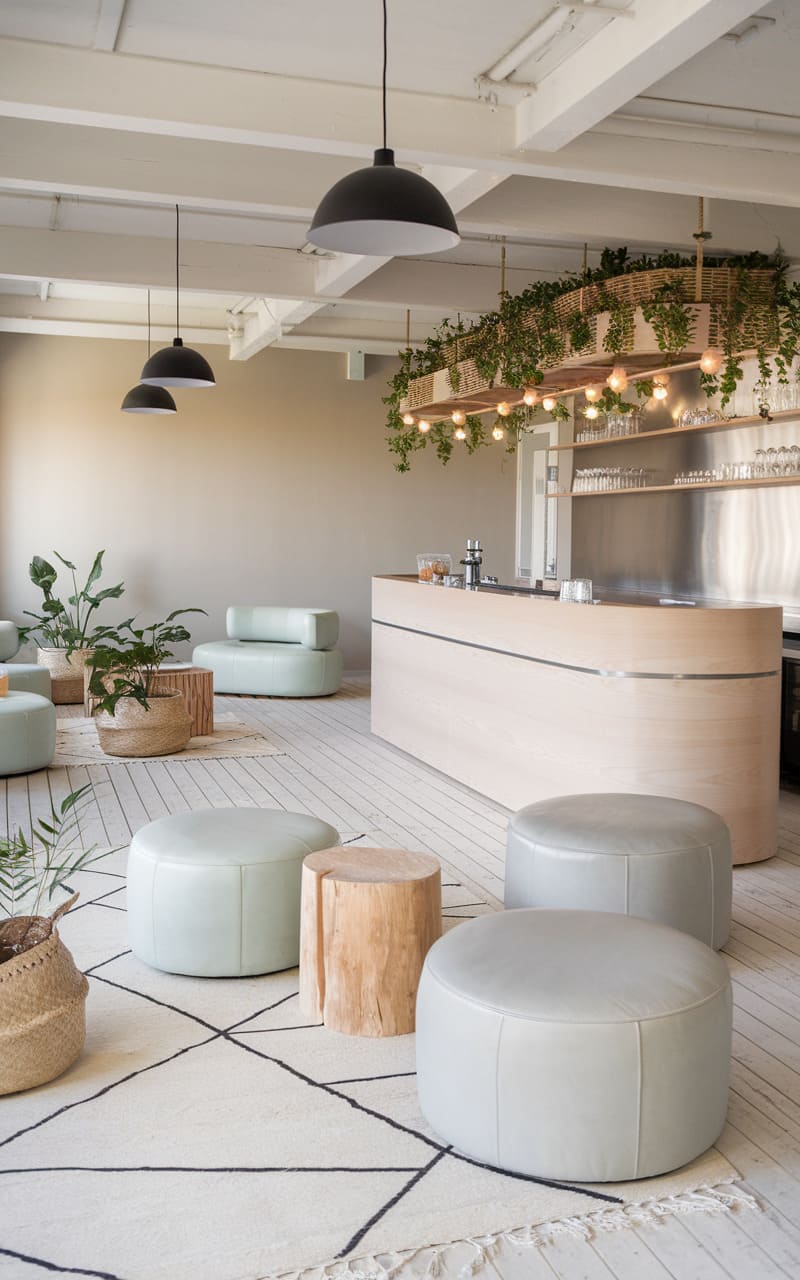 Evoking a clandestine yet cozy ambiance, this home speakeasy presents a delightful blend of rustic charm and modern elegance. Exposed beams traverse the pale ceiling above a minimalist bar crafted from light wood, while verdant foliage cascades in a suspended planter, subtly contrasting with the sleek black pendant lights. Plush, rounded seating in a muted mint hue clusters around a natural wood stump table on a geometrically patterned rug, the ensemble offering an intimate and inviting space for hushed gatherings and convivial libations. A collection of spirits gleams softly in the background, hinting at the revelry to come in this tucked-away sanctuary.