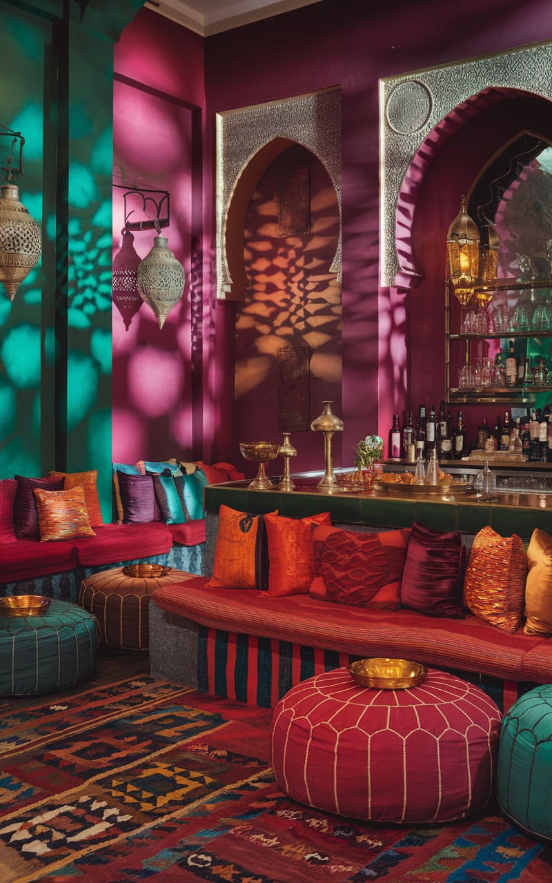 28. Boho-Chic Moroccan Speakeasy with Rich Textiles and Vibrant Colors