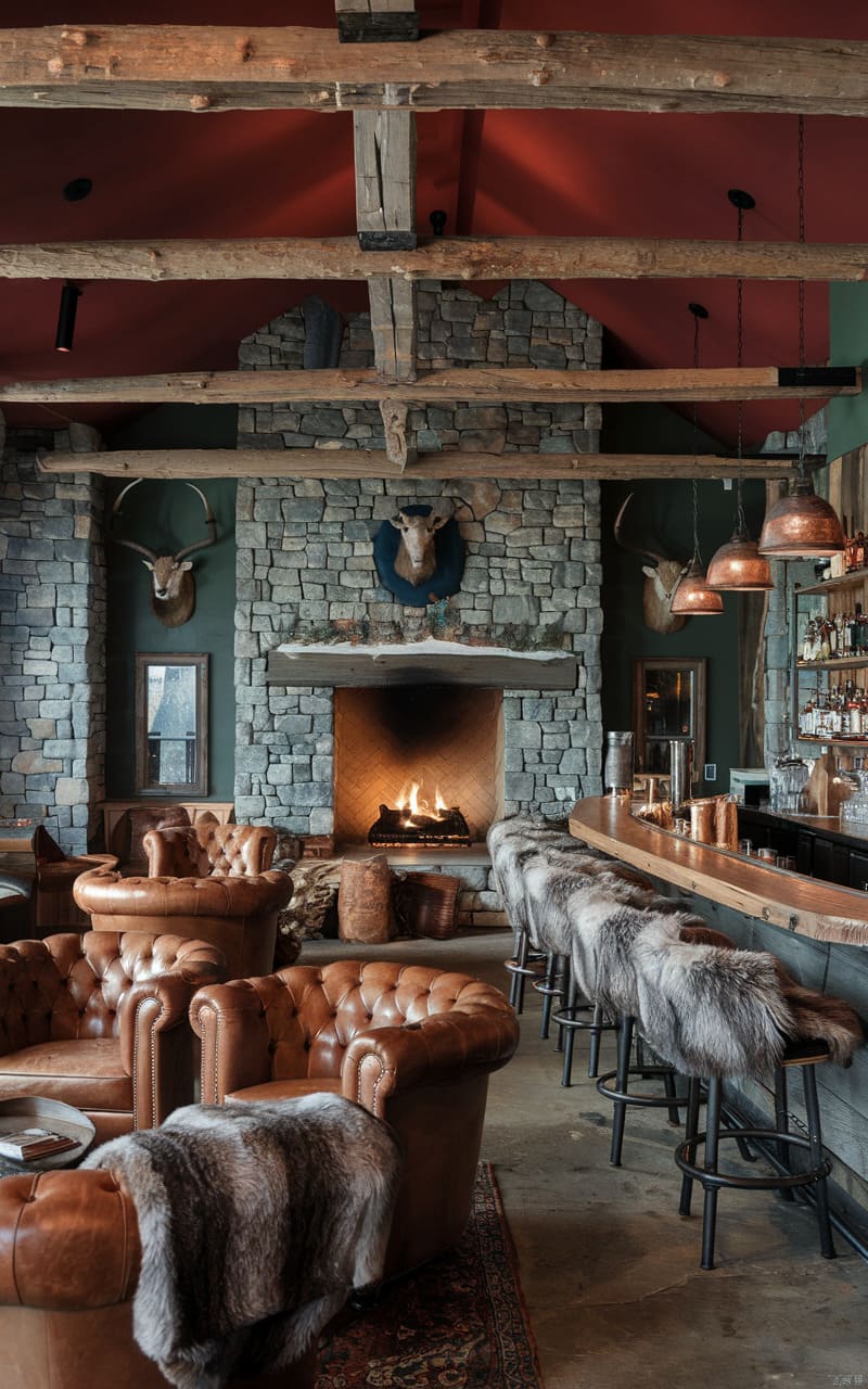 45. Alpine Lodge Speakeasy with Warm Woods and Stone Fireplace