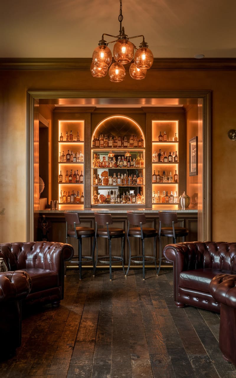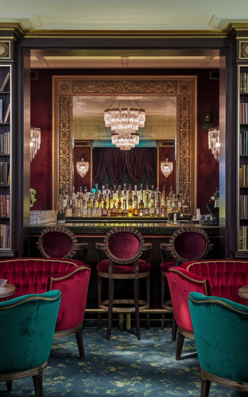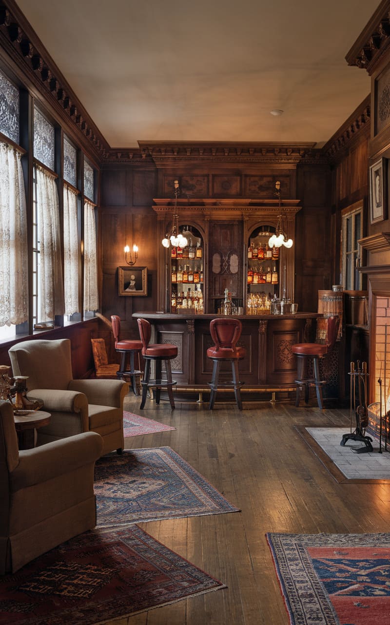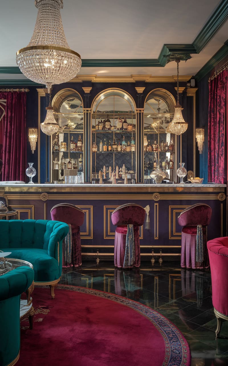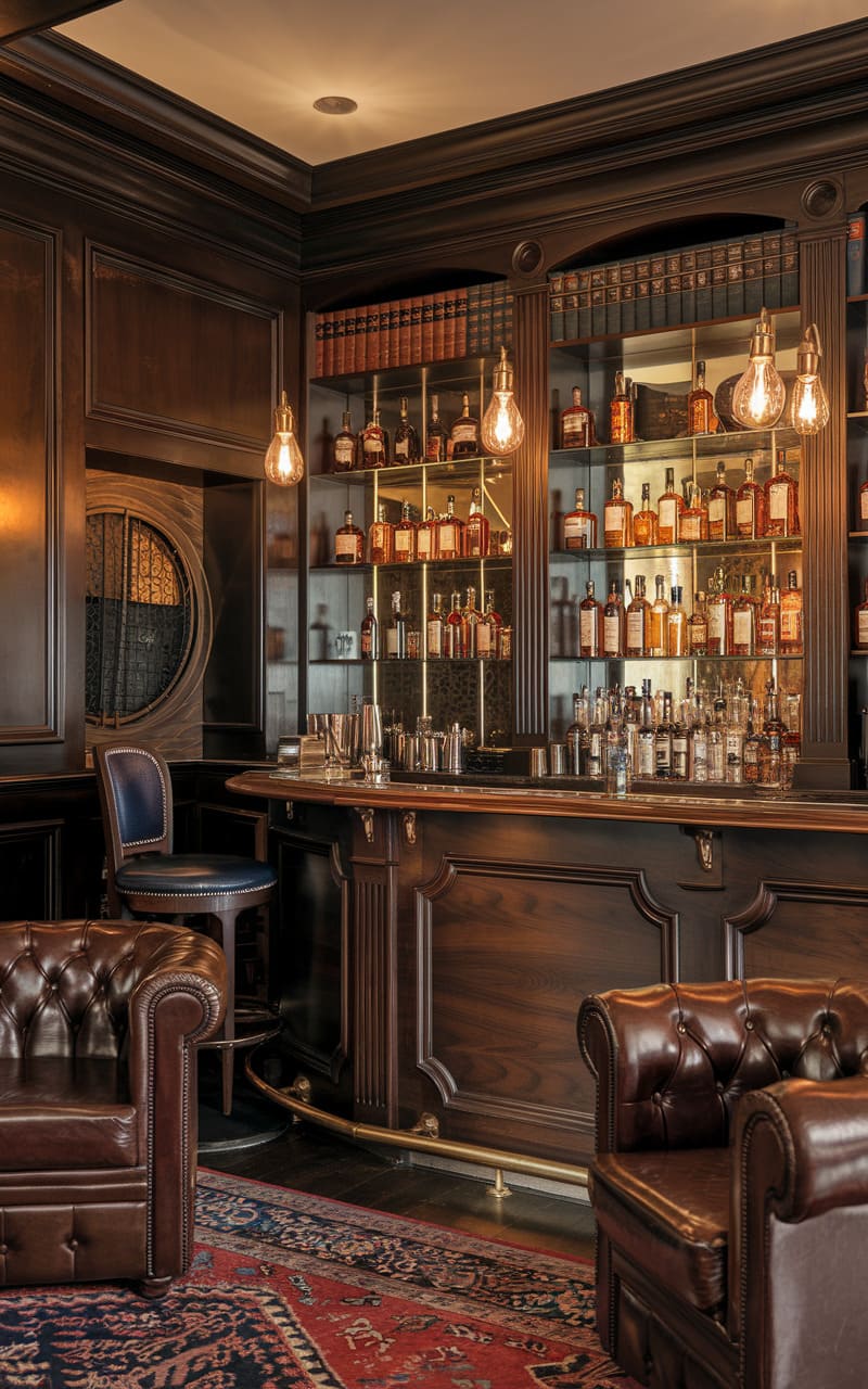 Envision a clandestine retreat bathed in warm, ambient light, where a home speakeasy exudes an air of vintage charm. Dark wood paneling and ornate molding line the walls, punctuated by plush velvet seating in rich jewel tones, crafting an intimate and luxurious atmosphere. Gleaming glassware and a well-stocked bar hint at expertly crafted cocktails, while the soft glow of pendant lights and a vintage chandelier cast playful shadows across the scene, inviting patrons to unwind and indulge in an evening of hushed revelry. The patterned rug adds a pop of color and intricate detail, grounding the space with a touch of bohemian elegance.