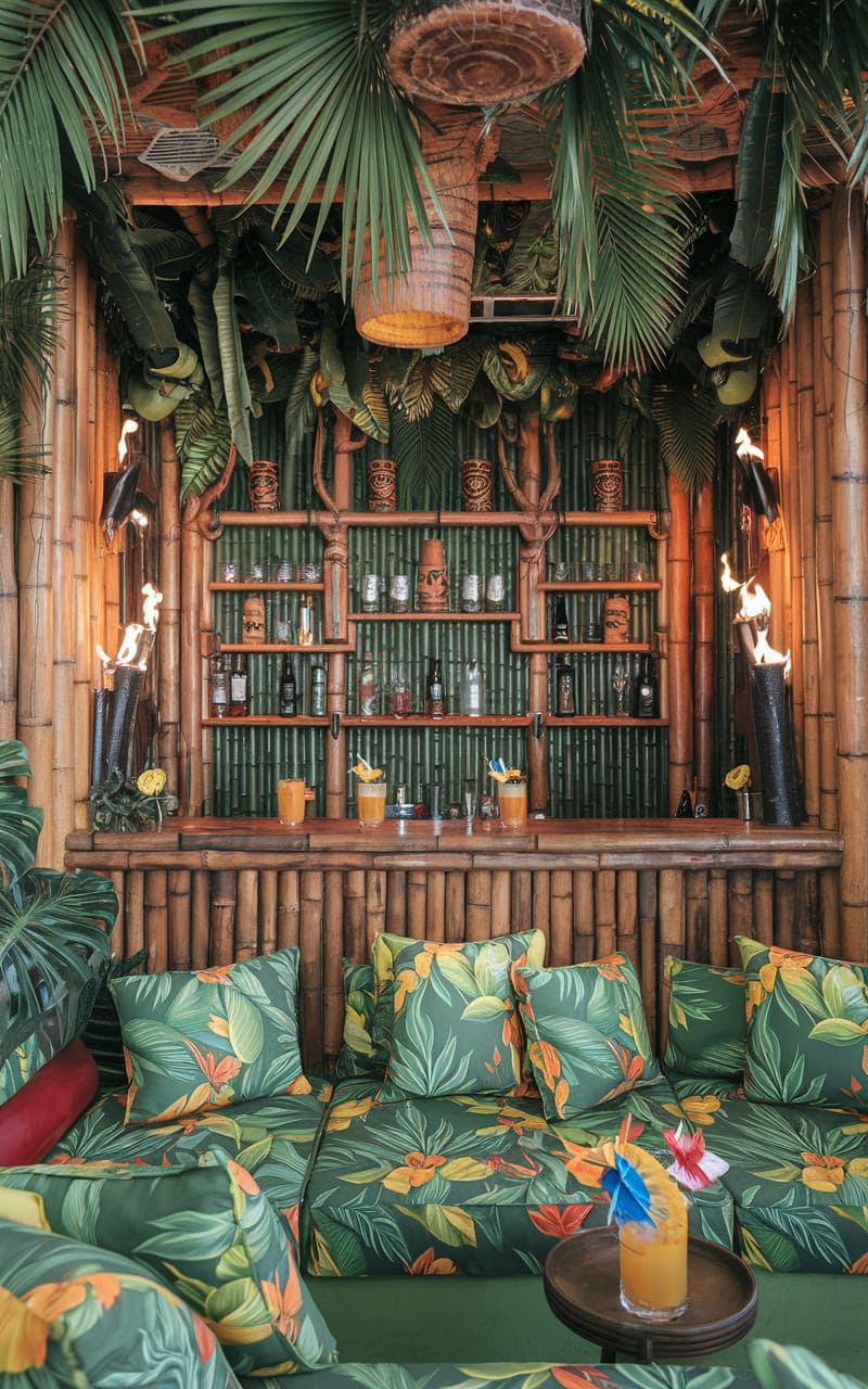 Envision a clandestine tropical hideaway, tucked into someone’s home, where bamboo walls rise to a thatched ceiling sheltering an array of tiki-themed glassware and spirits. Lush, leafy patterns adorn the plush sofa seating, echoing the exotic foliage woven through the bamboo framework above, while playful bird-shaped lights cast a warm glow upon the intimate scene. A solitary cocktail sits waiting on a small table, its vibrant hue mirroring the playful, escapist vibe of this secluded sanctuary designed for relaxed revelry.