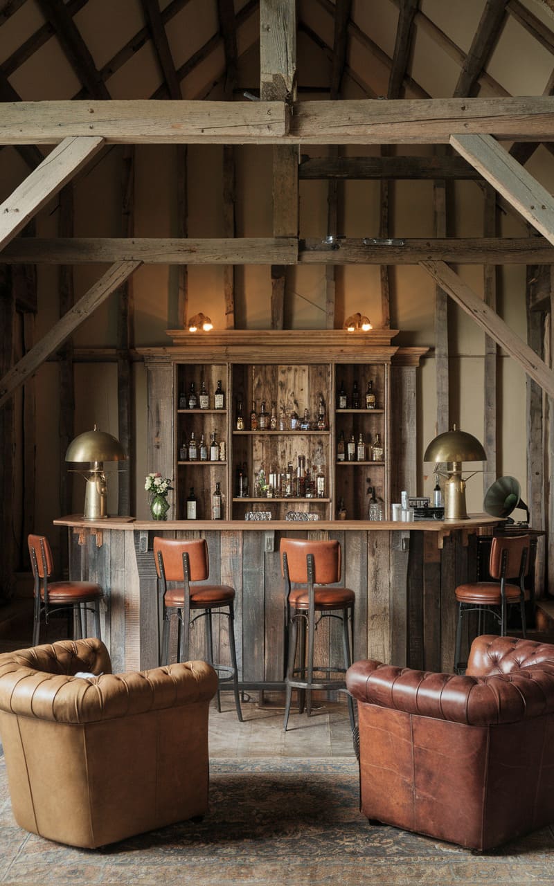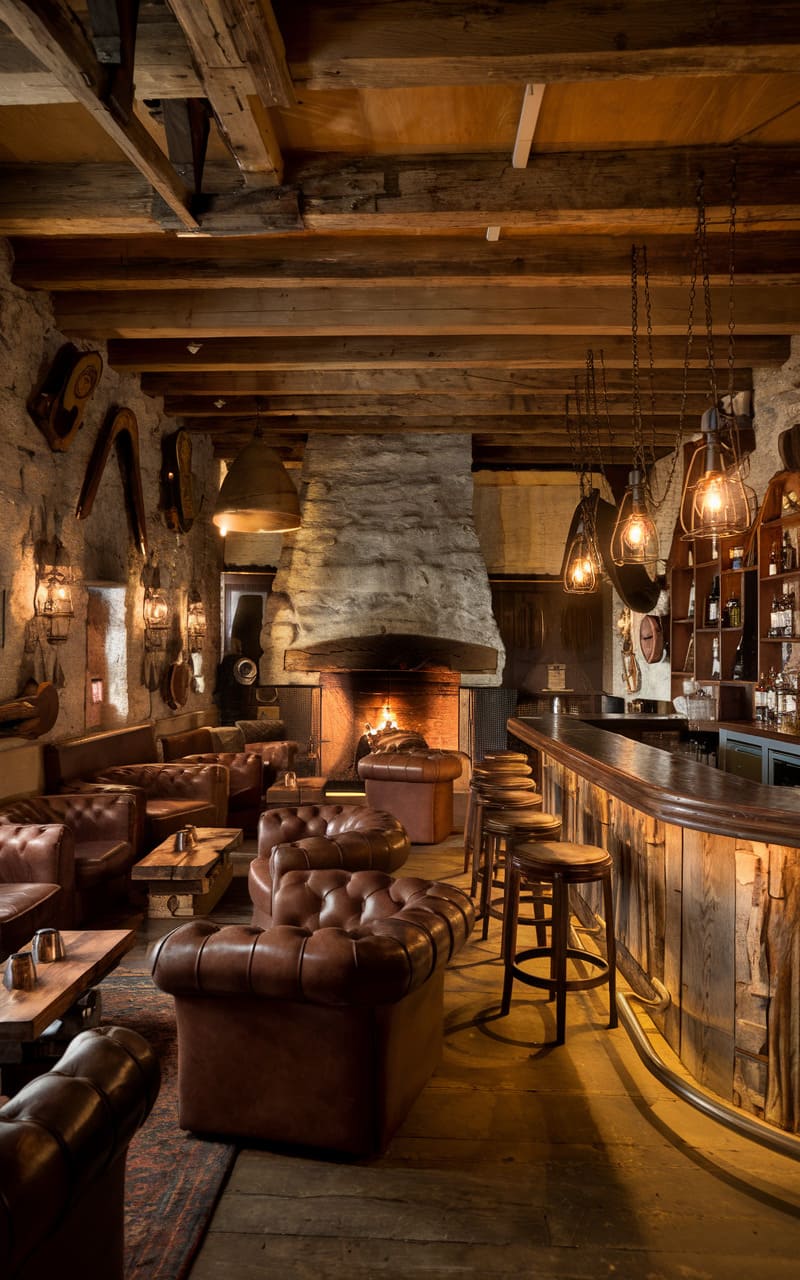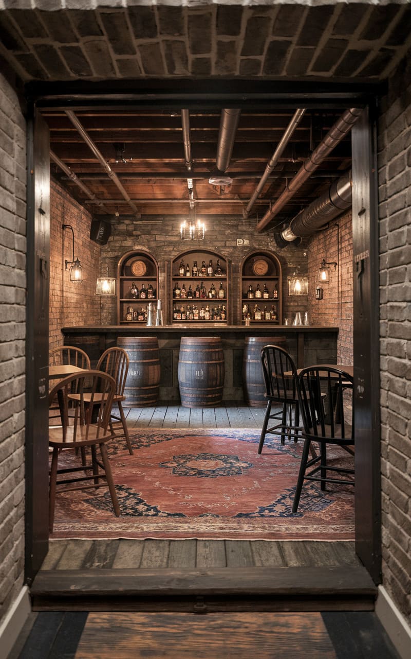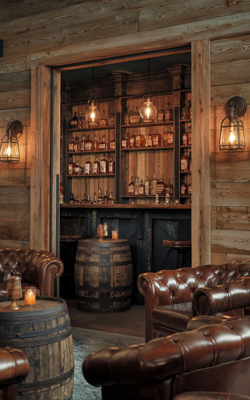 7. Rustic Cabin Speakeasy with Leather, Stone, and Whiskey Barrels