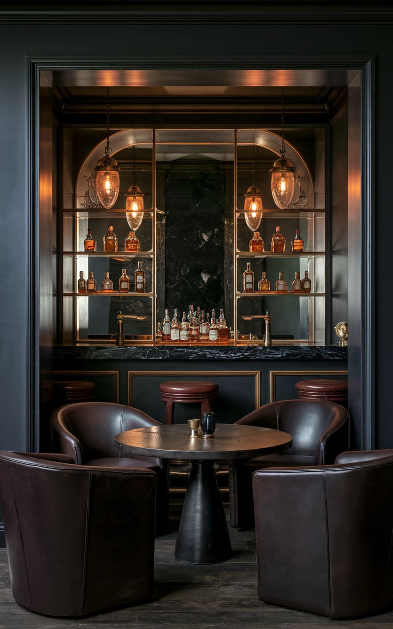 Imbibing an air of clandestine revelry, this art deco-inspired space presents a modern take on a home speakeasy. Emerald green velvet banquettes curve invitingly around a glossy black table, while geometric patterned flooring leads to a backdrop of shimmering bottles and glassware. Framed by elegant, mirrored panels and softly illuminated by pendant lights, the bar exudes a sophisticated yet intimate ambiance, perfect for hushed conversations and expertly crafted cocktails. Gleaming metallic accents trace the room’s contours, highlighting the rich textures and creating an atmosphere that is both luxurious and playfully secretive.