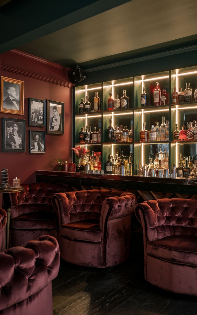 Bathed in a warm, dim glow, this intimate home speakeasy exudes a seductive charm with its rich, saturated color palette and plush textures. Deep teal walls provide a striking backdrop to the burgundy velvet armchairs, creating a space that feels both luxurious and intimate. A meticulously organized bar, illuminated by strip lighting, showcases an impressive array of bottles and glassware, promising expertly crafted cocktails. Framed vintage photographs add a touch of nostalgia, hinting at the storied gatherings this space was designed to host. The overall effect is one of sophisticated revelry, a secluded haven for discerning tastes and clandestine conversations.