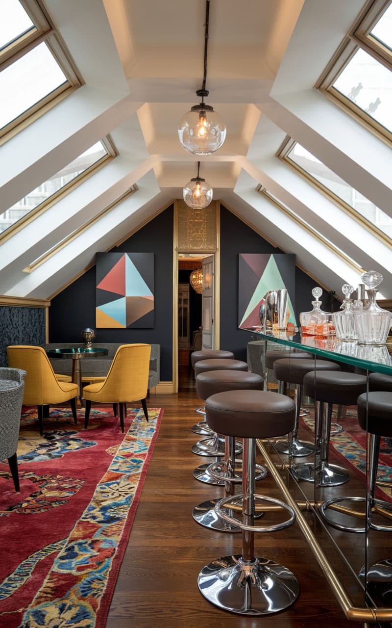 Nestled within the angular embrace of an attic space, this clandestine bar exudes a refined, masculine charm. Deep navy walls, clad in wainscoting, create a moody ambiance, punctuated by the warm glow of pendant lights and the mirrored display of spirits. A sleek, wooden countertop serves as the bar, complemented by two modern, grey bar stools, while plush seating invites guests to linger in the intimate space. The geometric lines of the architecture, from the sharply sloped ceiling to the angular lines of the bar’s design, contribute to the room’s distinctive and sophisticated feel.