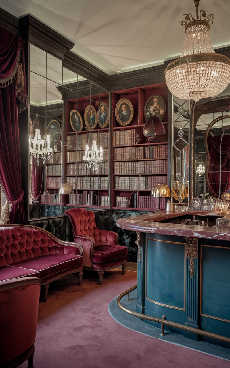 Drenched in rich jewel tones and boasting a distinctly vintage glamour, this home speakeasy exudes an air of theatrical sophistication and clandestine merriment. A plush teal velvet sofa anchors the space, its elegant lines echoed in the tufted backs of the adjacent bar stools, all bathed in the warm glow of ornate crystal chandeliers. Behind the bar, mirrored panels reflect a dazzling array of bottles, catching the light and hinting at the expertly crafted cocktails to come. Deep crimson drapes frame the scene, adding a touch of drama and contrasting beautifully with the emerald green accents and the polished gleam of the floor. It’s a space that feels both intimate and opulent, a hidden gem designed for stylish revelry and hushed conversations in an atmosphere of timeless elegance.