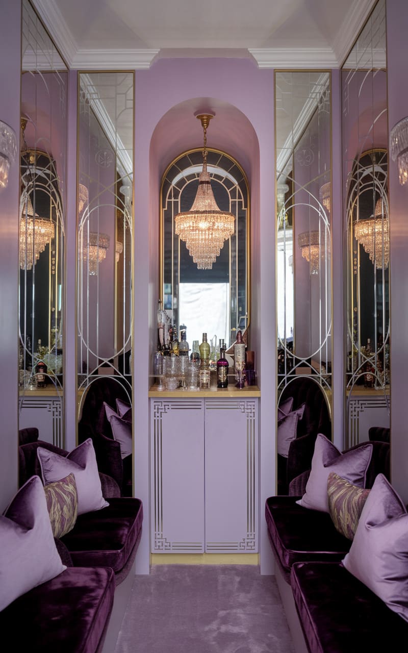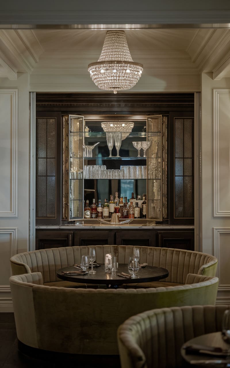 Bathed in the soft luminescence of a grand crystal chandelier, this sophisticated home speakeasy presents a picture of refined revelry. A curved banquette, upholstered in plush velvet, invites intimate gatherings around a low, round table set with glassware and flickering candlelight. Behind, a mirrored bar with glass shelving showcases an array of bottles, reflecting the light and adding depth to the space, while the elegant paneling and subtle textures of the surrounding walls contribute to the room’s overall air of understated glamour.