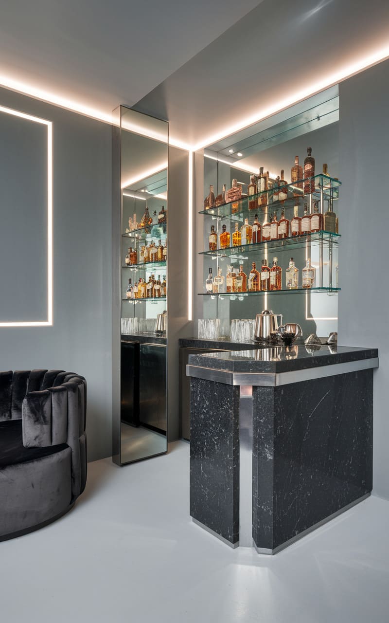 Bathed in a pulsating glow of neon and mirrored reflections, this home speakeasy is a dazzling ode to retro-futurism. The curved banquette seating in shimmering champagne hues invites intimate gatherings, while the mirrored backdrop multiplies the sparkle of disco balls suspended overhead, casting playful light across the sleek surfaces. A curated selection of spirits lines the illuminated shelves, promising expertly crafted cocktails to the backdrop of vibrant artwork. The bold lines and unapologetically glamorous aesthetic create a space that’s both visually arresting and irresistibly fun, a private haven designed for stylish revelry.