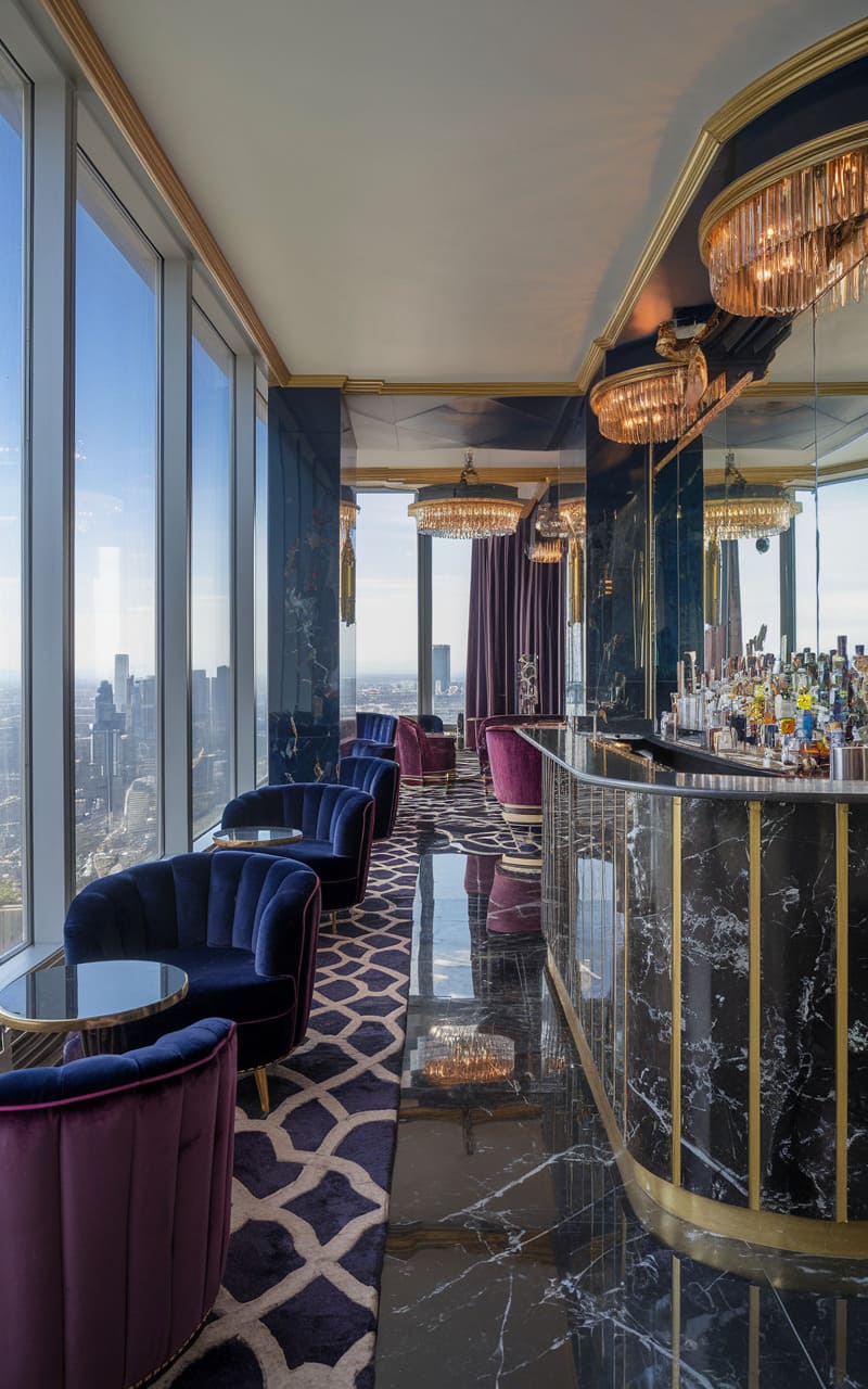 Bathed in the warm glow of a setting sun, this rooftop speakeasy exudes an air of clandestine sophistication. Plush velvet sofas in sapphire and ruby tones invite intimate conversation, while the sleek, mirrored bar reflects the golden hues of premium spirits. Overhead, a glass ceiling hints at the twilight sky, subtly framed by the geometric patterns of the room’s design. Modernist lamps cast a soft, ambient light, highlighting the rich textures and considered composition of the space, a haven crafted for stylish revelry high above the world.