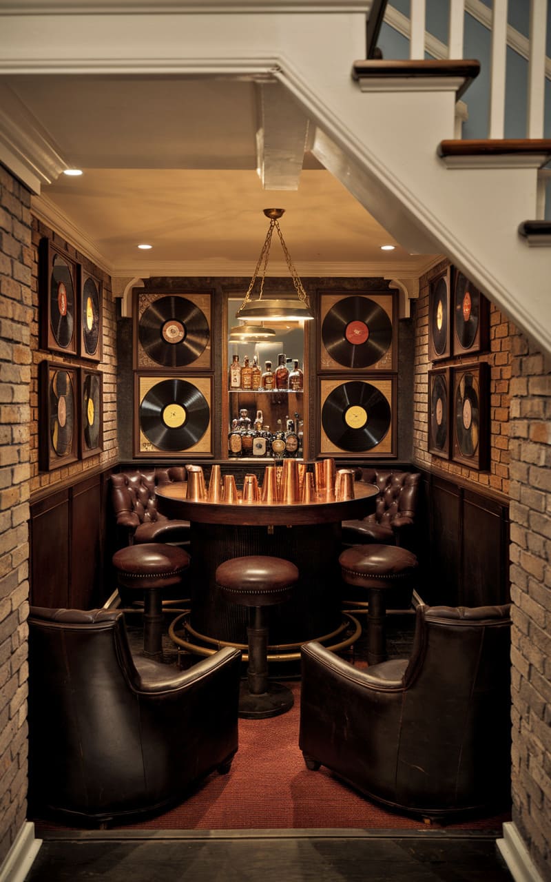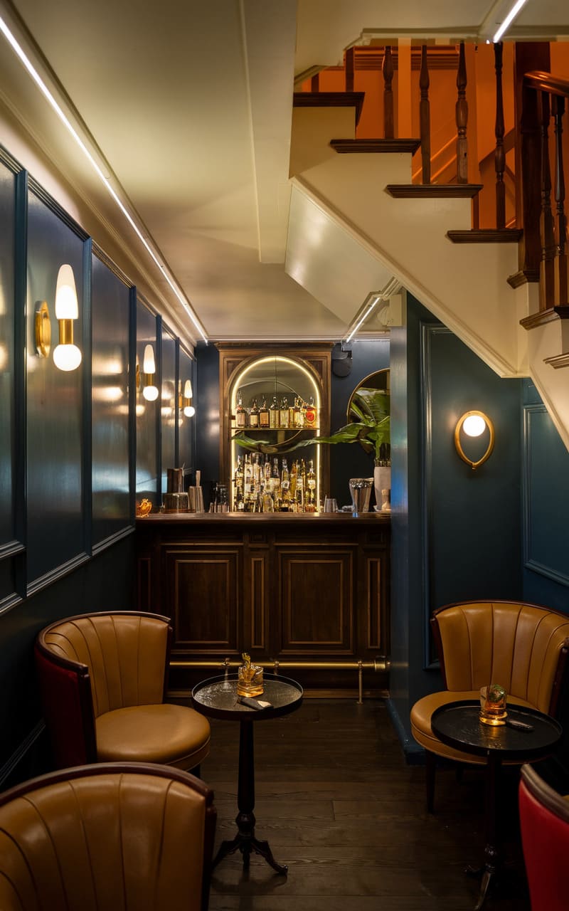 A warm, intimate ambiance permeates this cleverly designed under-stair speakeasy, where deep teal walls and rich wood accents create a sophisticated retreat. Gleaming bottles line the mirrored back of the petite bar, reflecting the soft glow of modern sconces and the amber spirits waiting to be poured. Plush, caramel-colored seating invites guests to linger, fostering a sense of clandestine camaraderie in this tucked-away haven of stylish indulgence.
