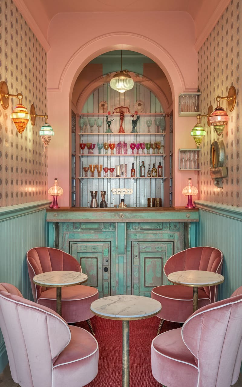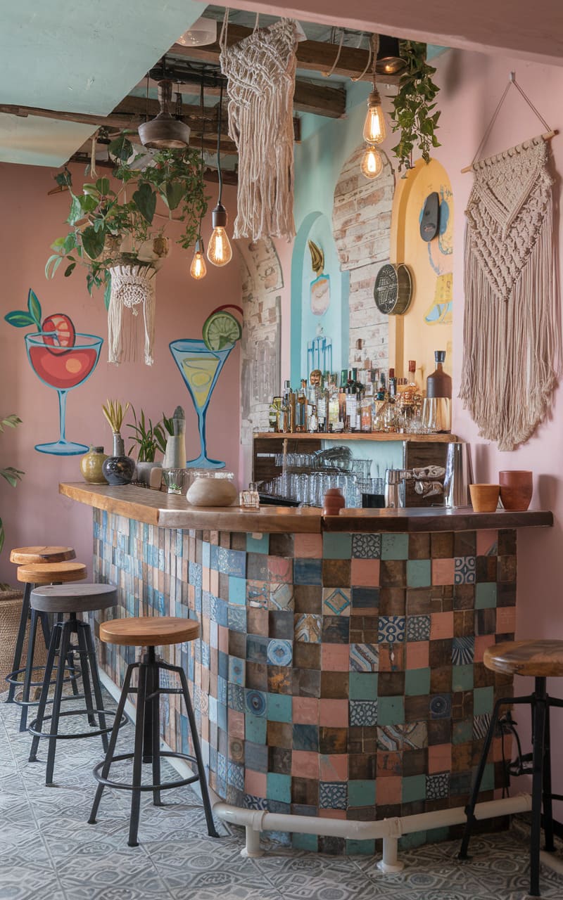 Sunlight streams into this bohemian hideaway, illuminating a space where rustic charm meets playful sophistication. A curved bar, adorned with a patchwork of weathered tiles, anchors the room, its copper countertop gleaming under the warm glow of pendant lights. Macrame wall hangings and trailing vines soften the edges, casting delicate shadows across the blush-pink walls punctuated with hand-painted cocktail glasses. With its mismatched stools and eclectic decor, this speakeasy whispers tales of sun-drenched afternoons and carefree revelry, a sanctuary infused with a touch of whimsical artistry.