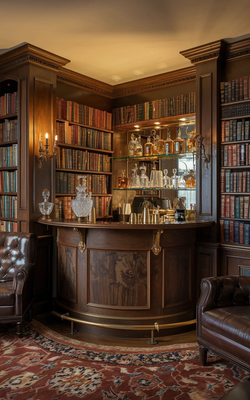 Nestled within a bibliophile’s dream, this clandestine cocktail corner exudes an air of hushed sophistication, its tufted leather armchairs beckoning toward a dimly lit bar framed by towering bookshelves. A warm glow emanates from the vintage-inspired bar, showcasing an array of bottles and glassware, hinting at expertly crafted concoctions and whispered conversations yet to unfold. The rich, textured walls, adorned with framed prints and sconces, add to the intimate, almost theatrical ambiance, suggesting a space where secrets are shared and stories unfold amidst the comforting embrace of aged paper and fine spirits.