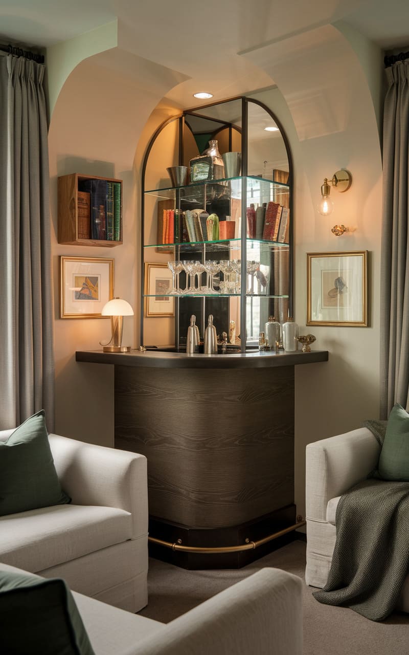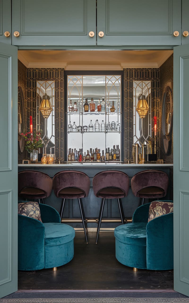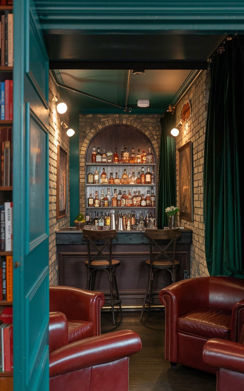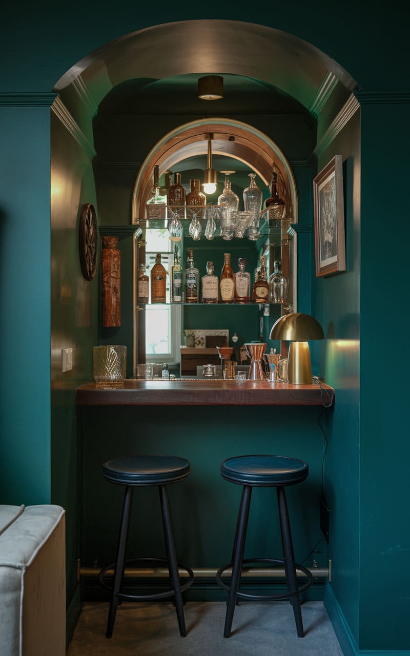 Nestled within a richly painted, teal-hued alcove, this intimate speakeasy exudes a vintage charm, its compact design maximizing both style and function. A dark wood countertop gleams under the warm light of a brass-accented lamp, showcasing an array of bottles and glassware arranged with a meticulous, almost apothecary-like precision. The arched opening, mirrored at the back, cleverly amplifies the space and reflects the warm tones, creating an illusion of greater depth. Two sleek, backless stools invite patrons to sidle up and partake in the crafted cocktails, while the deep teal walls, adorned with framed artwork and a decorative plate, cocoon the space in a moody embrace, fostering a sense of clandestine revelry. Hints of gold trim accentuate the opulence, transforming this tucked-away corner into a sophisticated sanctuary for the discerning imbiber.