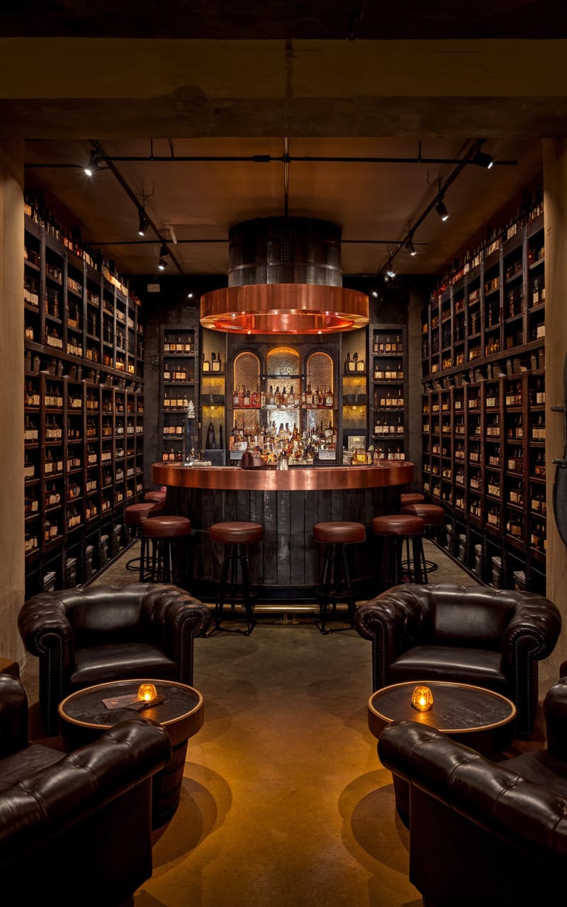 Stepping into this clandestine bar feels like entering a time capsule, the warm glow of pendant lights reflecting off the copper- clad walls and bar front. A well-stocked bookshelf stands sentinel beside a collection of spirits, hinting at hidden knowledge and potent potables. Plush leather barstools await patrons seeking expertly crafted cocktails, the promise of hushed conversations and a unique, intimate ambiance hanging in the air. Gleaming copper pipes snake across the ceiling, an industrial touch in this otherwise richly textured space, suggesting that even the most refined pleasures can be born of raw, elemental forces.
